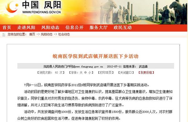 | 为积极响应校团委号召,深入开展暑期“三下乡”社会实践活动,药学系2011级药学本科9班同学联合凤阳县武店镇计生办、武店镇团委,开展了以“享受健康 珍爱生命”为主题的送医下乡社会实践活动,以增加农村卫生健康知识的普及。 活动选择在武店镇政府门前街道、村委会等人流较为集中的地点和农家门口进行宣传。同学们通过发放传单的形式,重点对农村易发的烧烫伤、食物中毒、农药中毒、狂犬病等伤病的应急自救知识进行了详细介绍,并现场为村民进行细致的讲解。同时,大家制作并向村民分发健康生活知识调查问卷,内容涉及食盐、糖的摄入量、溺水急救、安全用电等。