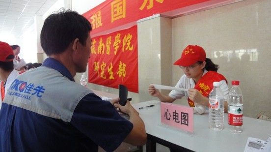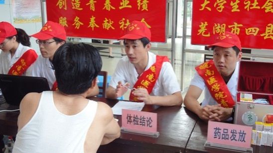 7月2日,在校团委的关心和帮助下,研究生部开展暑期“三下乡”社会实践活动,深入社区及工厂生产一线为广大社区群众及工人开展健康体检及医疗咨询服务等活动。 当天上午,研究生暑期“三下乡”实践队来到芜湖市弋江区南瑞社区服务站,分6个小组分别为广大社区群众开展内科、外科、妇产科、儿科及全科医学的体检及健康咨询服务,并建立健康档案,上午接待社区群众约300人次。 当天下午,队员们又来到芜湖县新芜经济开发区,开展防暑宣传,为炎炎夏日里坚守在生产一线的工人师傅们进行健康检查,并解答其提出的健康问题和对其生活习惯进行指导。