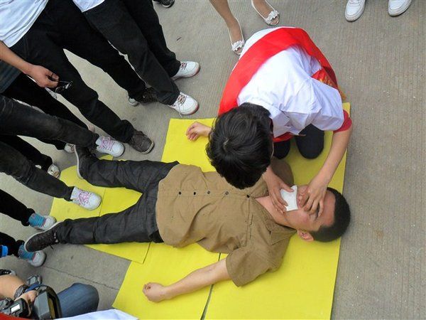 志愿者进行急救演练 志愿者还分别组成电脑维修分队、血压测量分队等,为社区居民免费提供电脑维修服务和血压测量、健康咨询等服务。