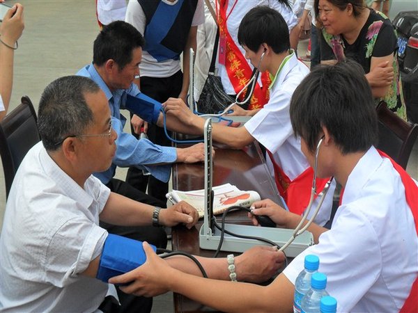 志愿者为社区居民测量血压 在此次实践活动中,志愿者们向居民普及和宣传防震减灾的知识,不仅提高了自身的实践能力、团队精神和综合素质,更重要的是通过对这些知识、常识和技能的宣传,唤起了居民对防震减灾工作的重视,增强了他们安全忧患的意识。