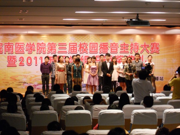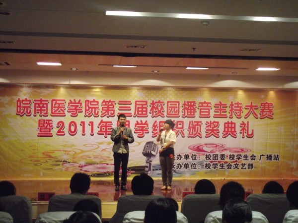 2012年5月4日晚,我校第三届校园广播主持人大赛决赛暨2011团学组织颁奖典礼在校学术报告厅举行。经过6个月的初赛和复赛,8名选手从480名参赛同学中脱颖而出,亮相本次总决赛。校团委副书记李娜、许国飞,各系部团委团干和500余名同学观看了本次比赛。