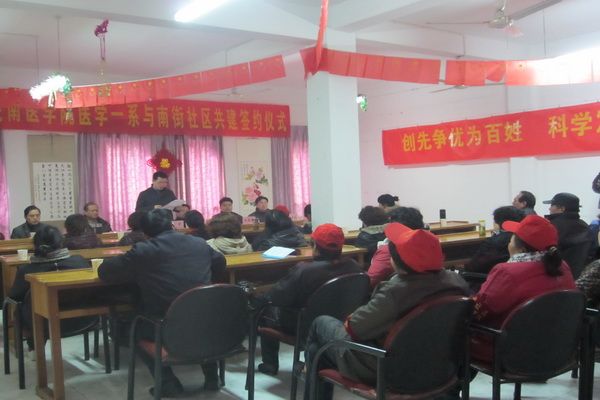 3月23日下午,医学一系党总支副书记韩军、王金权和系团委书记吴金庭、系学生会副主席李梦曦等一行前往弋江桥街道南街社区,与南街社区共同探讨共建活动的开展,并举行了医学一系与南街社区共建签约揭牌仪式。弋江桥街道办事处副主任陶绍龙和街道人武部长江来喜、南街社区党委书记鲍小龙以及社区群众代表参加了仪式,仪式由南街社区党委副书记杨晓霞主持。