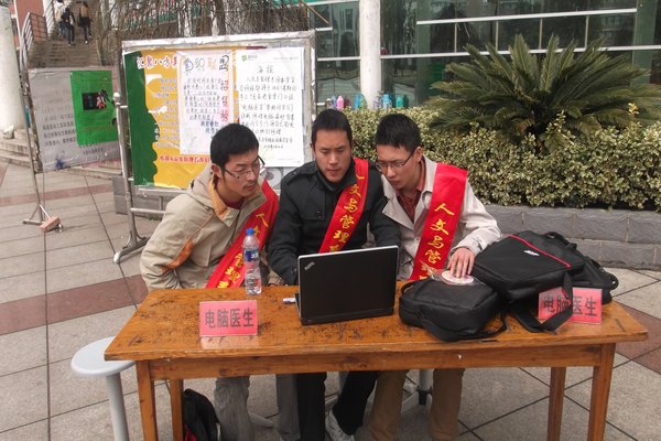 传承雷锋精神,“电脑医生”深入校园。为进一步弘扬志愿精神,深入开展学雷锋志愿服务活动。人文与管理系2010级和2011级同学从即将实习的2009级学长手中接下了“电脑医生” 雷锋志愿服务队的接力棒。于3月18日上午9点在校设立“电脑医生”站,进行电脑“义诊”。“电脑医生”们分为电脑小常识组和电脑维修组两个活动小组。志愿者充分发挥专业特长,学以致用,为同学们细心修理电脑,受到了大家的一致好评。