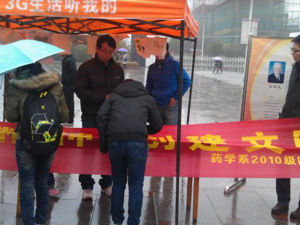 为弘扬雷锋精神,构建和谐校园。药学系2010级团总支学生会于3月5日在新食堂广场开展了以“弘扬雷锋精神,创建文明校园”为主题的签名活动。 活动中,虽然一直下着小雨,但阻挡不了同学们的热情。在巨大的横幅上面,同学们纷纷郑重地写下自己的名字,许下承诺:从自身做起,践行雷锋精神。 此次活动的成功举办,不仅激发了同学们学习雷锋精神的热情,而且增强了同学们的责任感和使命感,同时也展现出皖医学子奋发激昂、积极向上的良好精神风貌。