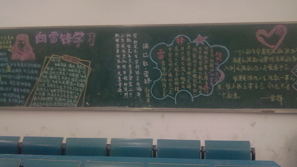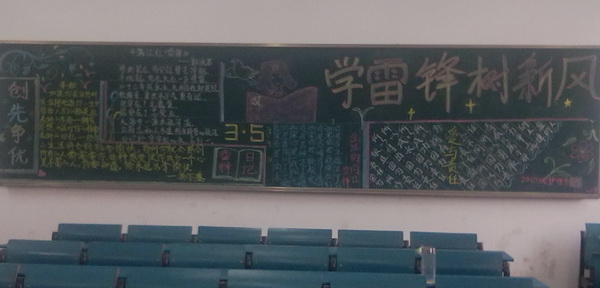 为进一步弘扬雷锋精神,引导广大学生树立正确的人生观,价值观。2012年3月2日至3月5日,护理学系2010级专科与2011级本科合作开展“知雷锋、颂雷锋、学雷锋”为主题的黑板报宣传教育活动。同学们分别在新校区1、2号教学楼的小教室里以黑板报的形式宣传雷锋事迹,抒发自己的感悟,结合创先争优活动,将雷锋精神与时代精神有机结合,并赋予新的内涵;在提高自身认识的同时,对广大青年学生立志成才,报效祖国,服务人民也是一种启迪。