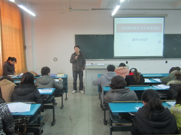 为交流实习心得,更好地了解同学们一年的实习生活,12月21日下午,医学三系在2号教学楼204、203教室分别召开07级口腔、法医专业实习生返校座谈会。医学三系党总支书记唐传莉、主任陈阳、副书记柴琳、副主任王云和全体2007级同学参加本次会议。座谈会由口腔、法医辅导员张晋艳、张萍老师主持。