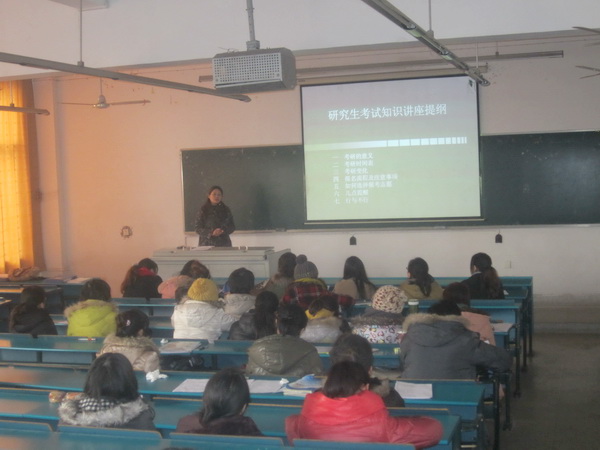 讲 座 本次讲座邀请校研究生部副书记郑兰荣主讲。在讲座中郑兰荣副书记就考研的意义与优势、心态调整、备考、应试、复试及调剂等几个方面的问题作了指导。她指出,面对目前大学生就业困难的前景,考研是比较好的选择。在最后的关键时期,保持良好的心态、坚定信念至关重要,并针对应试、复试及调剂的方法、技巧等作了详细讲解。 (张利、张晋艳/文 梅佳欣/摄 唐传莉、张卉/审) |