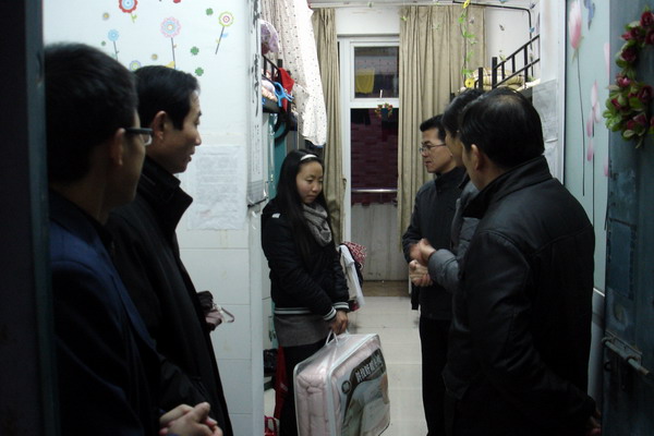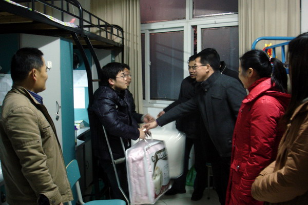 气温骤降,天气变冷,为帮助我系家庭经济困难学生渡过严寒,12月12日下午5时,学生处副处长崔晓霞,系党总支副书记韩军、王金权,系副主任蒋韶明与各年级辅导员来到4号、6号学生宿舍楼看望部分家庭经济困难学生,给他们赠送了冬被,带去了温暖。