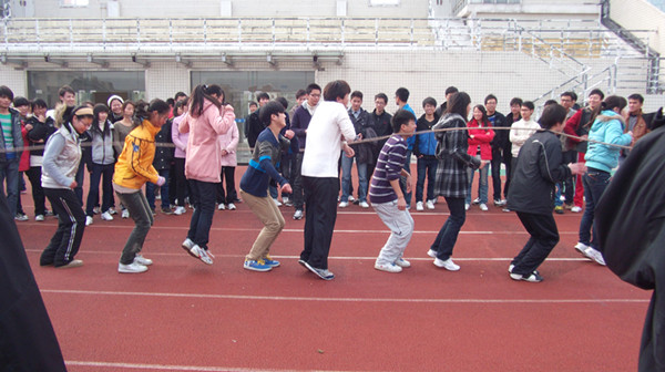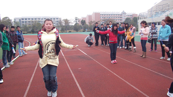 12月4日下午两点,药学系2010级团总支学生会在校田径运动场举办"炫动青春"跳绳比赛。 本次跳绳比赛包括集体跳绳和单人跳绳两个项目。比赛以每个班级为单位,长绳、短绳两个项目同时展开。每支队伍组成的长龙在田径场上回旋舞动。队员们个个情绪高涨,斗志昂扬,笑声和汗水一同挥洒,整个赛场成为一片欢腾的海洋。当裁判员一声令下,选手配合着摇绳的同学以飞快的速度跳了起来,舞动的长绳秀出了同学们的青春活力,起跳的动作彰显了他们的朝气。摇绳的同学时刻专注着,努力配合着跳绳的选手,尽量减少失误。时间虽然那么的短暂,却足以显示出选手们齐心协力,团结合作的精神。场上加油声、欢呼声此起彼伏,热闹非凡。 本次活动旨在用运动展现我们当代大学生的“绳”彩飞扬,增强班级的凝聚力与合作能力。通过这次比赛,展现了团结文明的良好风貌,在团结中感受到集体力量的强大。同时增进了同学之间的交流,广大同学培养了互助友爱精神,丰富了同学们的课余生活以及校园文化生活。