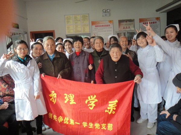 初冬之际天高气爽、阳光明媚,护理学系第一党支部于11月19日组织开展了敬老院之行――“感恩社会 关爱老人”活动。 同学们对老人的关心由心而发,都踊跃参加、积极投入到这次活动中。活动深入到敬老院的每一个房间,同学们主动帮助那些行动不便,自理困难的老人穿衣梳头修剪指甲,细心地为老人们量血压、测脉搏,围绕在他们膝前身后同他们聊天说笑逗他们开心,耐心地给他们做健康指导和宣传。大家与老人们相处的其乐融融、非常愉快。一位奶奶为表达老人们的谢意,特为同学们献上了她拿手的黄梅戏,歌声悠扬,掌声雷动,活动在一片欢声笑语中落下帷幕。