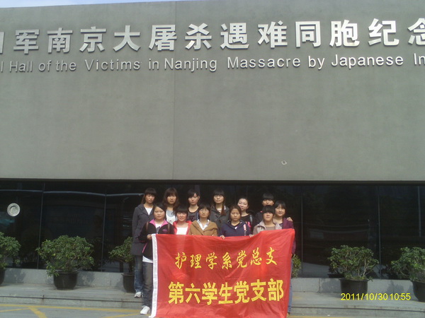 2011年10月30日,护理学系学生第六党支部怀着沉重的心情来到了南京侵华日军南京大屠杀遇难同胞纪念馆,开展爱国主义主题教育活动。 上午9:00,同学们来到纪念馆,首先映入眼帘的就是八个醒目的大字“前事不忘后事之师”。接着,在讲解员的讲解下,先后参观了展览集会区、遗址悼念区、和平公园区和馆藏交流区,一组组图片映入眼帘,反映着受害者当时遇难的情景。整个馆场的气氛始庄严肃穆,一幕幕血雨腥风的战争场景在同学们脑海中浮现,令同学们深受教育和震撼,更加坚定了振兴中华的信念和决心。