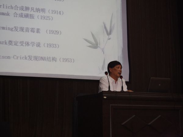 10月11日晚,在校关工委和药学系共同承办下,我校药理学教授、硕士研究生导师宋建国博士应邀在大学生活动中心作“药物 药学 药师”专业思想教育讲座。讲座由药学系主任吴少云主持。校关工委黄金余、姜国年,药学系党总支副书记李康才和药学系2011级新生聆听讲座。