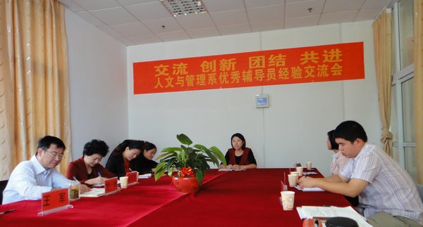 2011年9月20日下午,人文与管理系在会议室召开“交流 创新 团结 共进”优秀辅导员经验交流会。系党总支书记阮笑芳、主任胡鸿、副主任王军、系秘书及各年级专兼职辅导员、各系校级优秀辅导员参加会议,应人文与管理系之邀,校党委委员、组织部部长周强,人事处副处长张建英,学生处副处长崔晓霞参加会议,会议由系总支书记阮笑芳主持。
