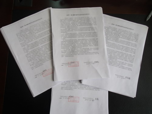 近期, 2008级、2009级分别开展了学生宿舍安全防火责任人承诺活动和宿舍消防安全责任书签订活动。活动中,要求各宿舍制定、健全寝室卫生值班制度,确定消防安全负责人,提高宿舍成员的安全意识。同学们普遍表示宿舍安全关系到每个同学的切身利益,并承诺树立“安全第一”的思想,统一于各自寝室张贴由年级制作的“安全防火负责人”贴,提高对人身财产安全的防范意识,不违章使用电器(电热毯、电饭煲、热得快等电热用具),不乱拉电线、网线,积极营造寝室内的良好环境。医学一系团委“学生宿舍自我管理委员会”组织学生干部对学生宿舍进行了检查,宿舍整体情况良好。