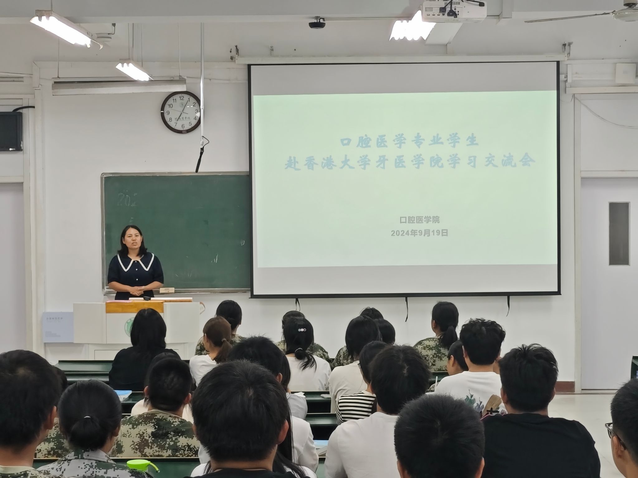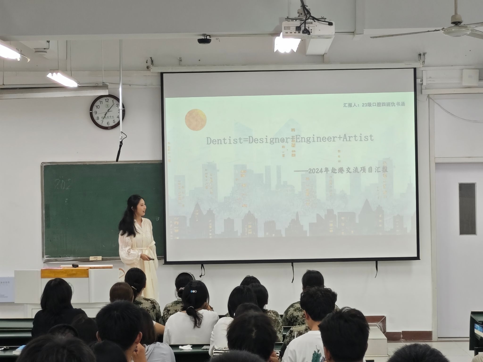 两位同学分别介绍了香港大学牙医学院的学习项目、口腔医学专业课程设置、学习课程安排,并重点就香港大学的教学理念、教学方式、全英文授课下的听课建议、全英文结业汇报与心得等方面内容进行了分享。两位同学表示,本次赴香港大学牙医学院学习交流,既学习了口腔医学领域前沿知识,感受到不同文化的熏陶,开拓了自己的视野,结识了许多志同道合的朋友,同时也认识到了自身在英语学习、口语表达、专业思辨等方面的不足。两位同学建议2024级新同学们在日常学习中应有广度、深度和内容新度,形成并保持良好的学习习惯,拓展思维、坚守医德、知行合一,在学有余力的情况下积极参加科研相关活动,尽早制定明晰的职业规划。