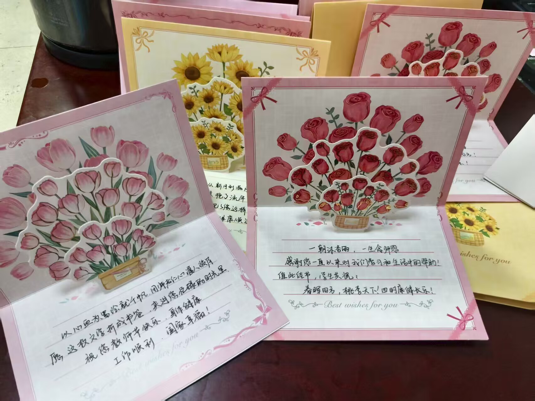 活动中,同学们亲手制作了一张张精美别致的贺卡,字里行间流露着对老师的深深祝福;于教师节当天前往教学课堂、临床医学实验实训中心等地为老师们送上了一盆盆绿植,向默默奉献的老师们表达了最真挚的感恩与祝福;通过短信、视频等多种形式,为老师们送上节日的祝福。一份份用心的礼物,一句句暖心的话语,让这个教师节充满了温馨与感动。