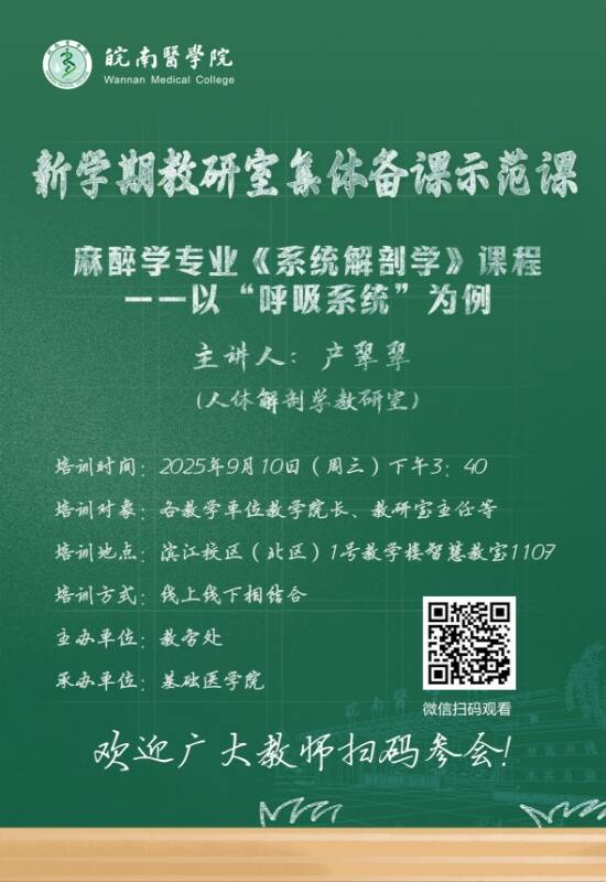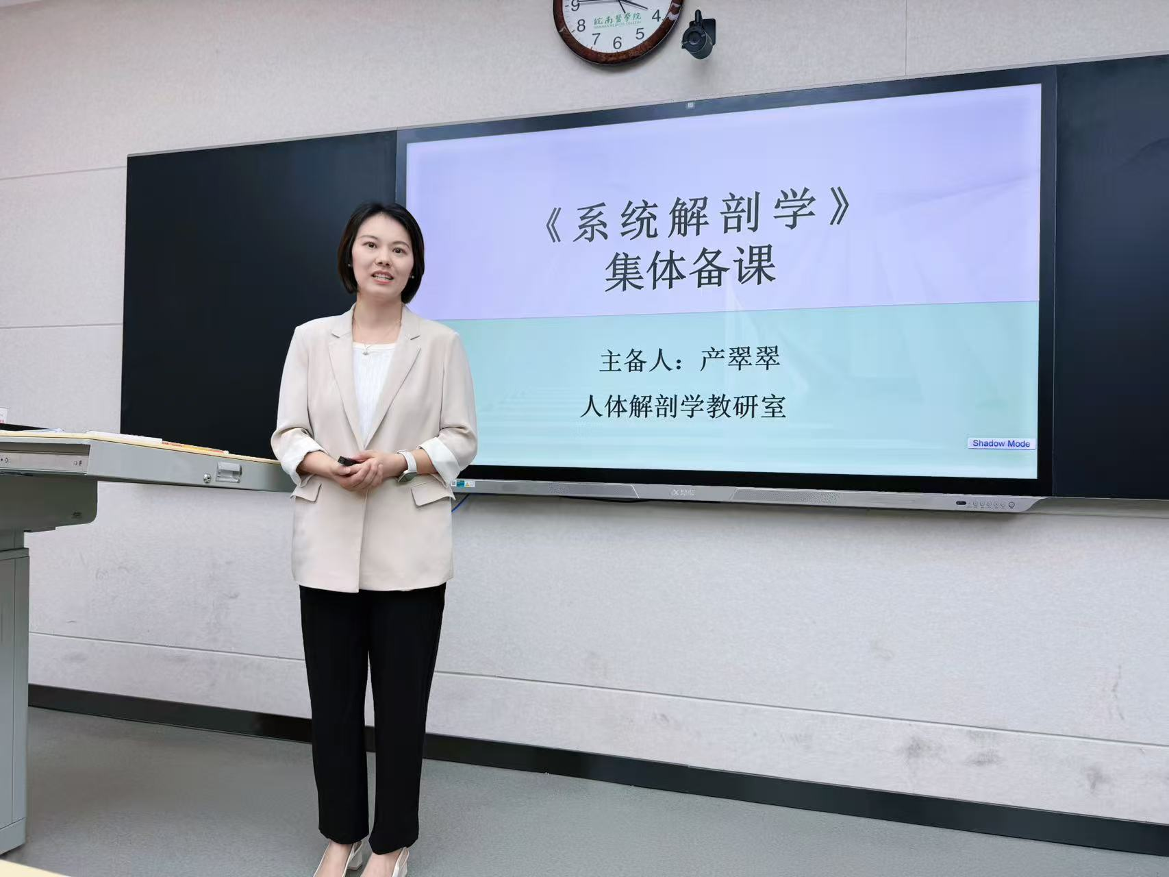 支部于9月10日下午组织开展了一场高质量的集体备课暨教学示范课观摩活动。本次示范课聚焦麻醉学专业《系统解剖学》课程,并以“呼吸系统”章节为例进行深入剖析。活动由全国青年教师教学大赛二等奖获得者产翠翠老师主导,从麻醉学专业人才培养方案、解剖学课程教学大纲、授课进程安排、执业医师考试要求等方面,将解剖学基础理论与麻醉学临床实践深度融合,通过虚拟仿真技术、3D打印模型、临床案例导入、课程思政设计等多种教学手段的融入,系统讲授了呼吸系统章节的重点和难点,并重点强调了与临床麻醉操作密切相关的要点。随后,与会教师们踊跃发言,分别就学情课情分析、教学内容设计、教学方法创新、课程思政融入、优秀教学资源共享,以及如何更好地服务于麻醉专业人才培养目标等议题进行了热烈而深入的研讨。现场学术氛围浓厚,思维碰撞激烈,有效凝聚了集体智慧,拓展了教学思路,也为《系统解剖学》课程教学质量的提升奠定了坚实基础。