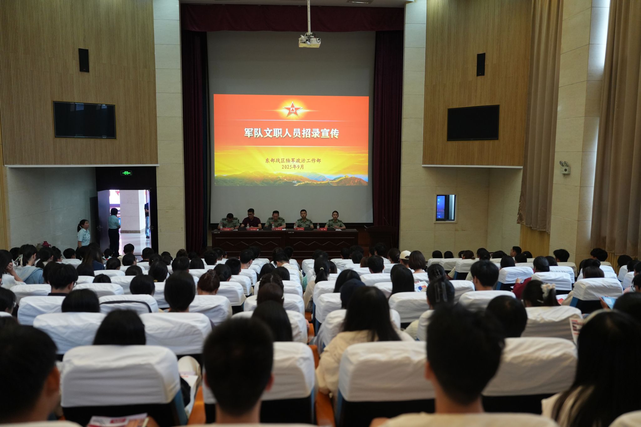 9月24日下午,东部战区陆军走进我校开展军队文职招聘宣传活动。活动在滨江校区(北区)逸夫科技楼一楼报告厅举行,吸引了二百余名有志于投身国防医疗事业的学生参与。