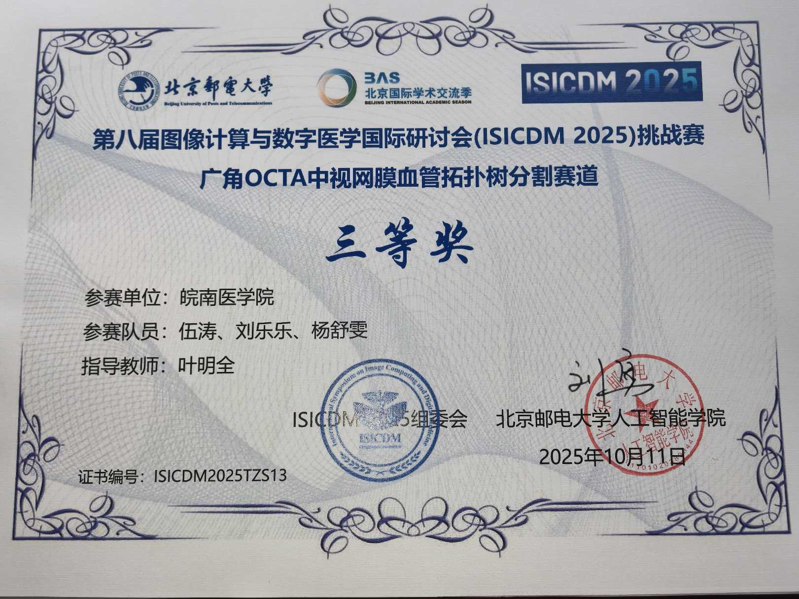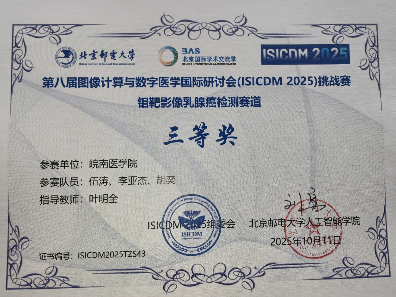 10月10日-12日,由国际数字医学会主办、北京邮电大学承办,清华大学、北京大学、电子科技大学等单位协办的第八届图像计算与数字医学国际研讨会(ISICDM 2025)在北京召开。此次大会举办了五个主题赛道的医学影像人工智能挑战赛,每个主题赛道设一等奖、二等奖、三等奖各1项。医学信息学院2025级人工智能专业硕士生伍涛等5名同学组成的两个团队,凭借技术创新方案和专业综合素养,获两个赛道三等奖各1项。