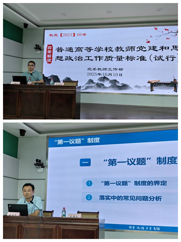 本次政策宣讲主要围绕《普通高等学校教师党建和思想政治工作质量标准(试行)》、改进文风会风、“两个议事规则”和“第一议题”等制度文件进行解读。党委教师工作部部长李祥子详细解读了学校贯彻落实《普通高等学校教师党建和思想政治工作质量标准(试行)》的具体方案,从党的领导、立德树人、精准供给、条件保障、持续改进五个方面,系统介绍了指标体系,并结合任务分解情况作了工作提醒。办公室副主任李鸿显对《皖南医学院改进文风会风实施细则》、二级学院“两个议事规则”及“第一议题”制度进行了深入讲解,结合具体案例分析了制度执行中存在的问题,并提出相关注意事项。
