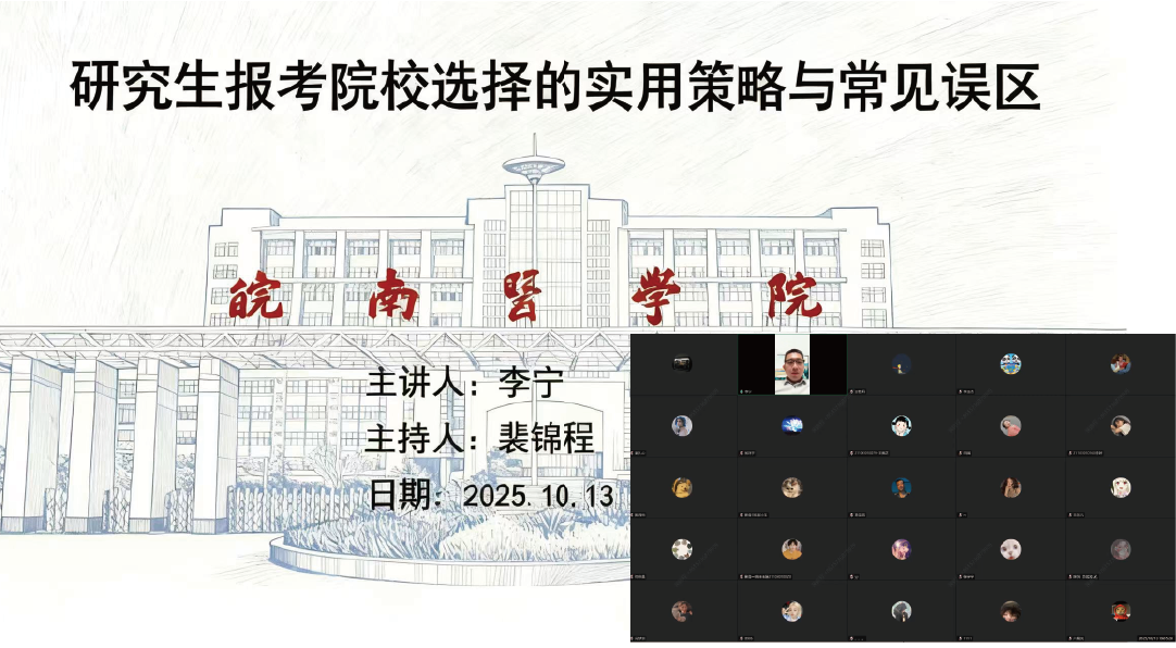为进一步指导学生研究生考试报名,帮助同学们科学规划升学路径,提高考研升学率,医学影像学院于10月13日晚以“研究生报考院校选择的实用策略与常见误区”为题组织开展线上指导讲座。活动由学院2021级辅导员裴锦程主持,2025级辅导员李宁老师主讲,全体2026届医学影像学专业考研报名同学参加。