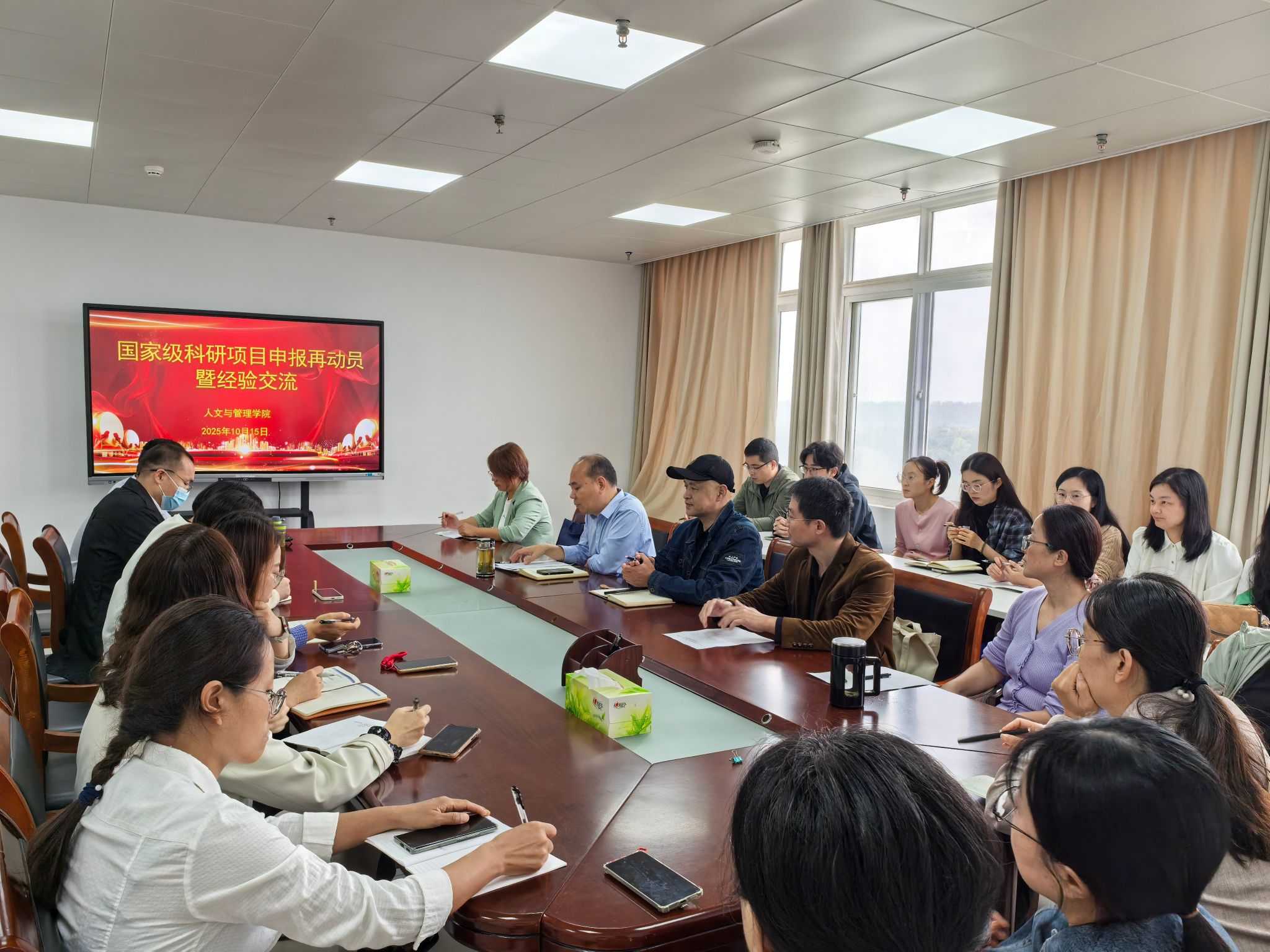 为全力以赴做好2026年度国家级科研项目申报组织工作,提升项目申报质量,10月15日上午,人文与管理学院精心组织开展了一场国家级科研项目申报再动员暨经验交流活动。此次活动吸引了学院高级职称教师、博士及在读博士、青年骨干教师等众多科研力量参与,学院党委副书记、院长王国平主持会议。