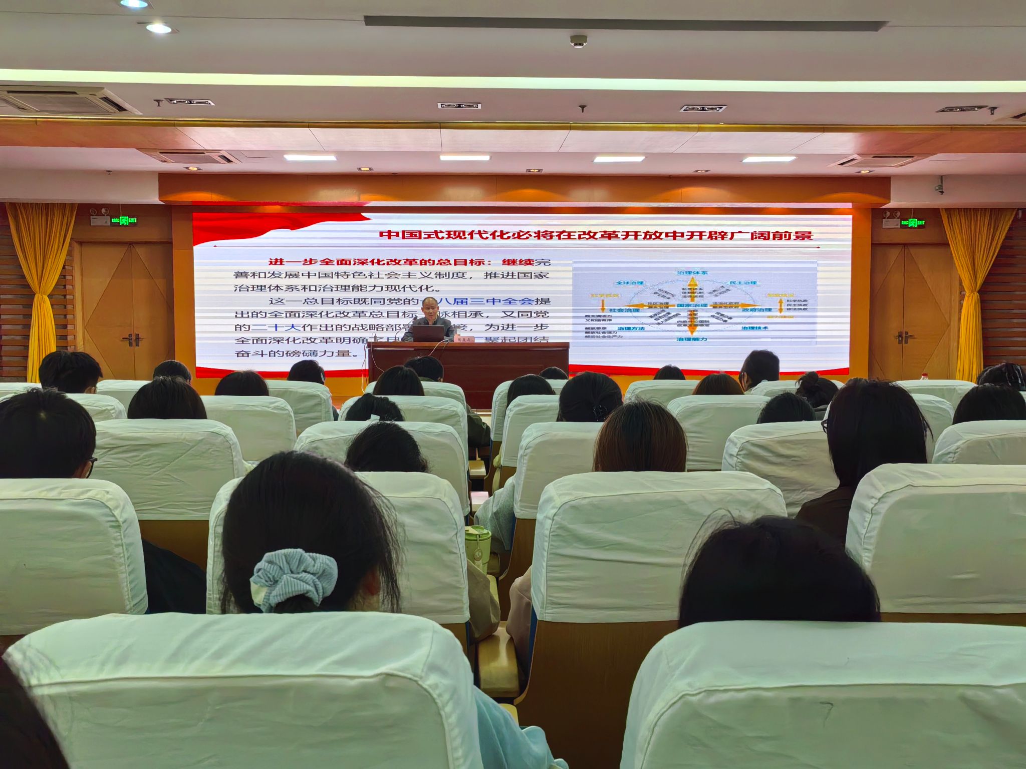 开班式在雄壮的国际歌声中圆满结束。马克思主义学院院长陶庭马讲授开班第一课。