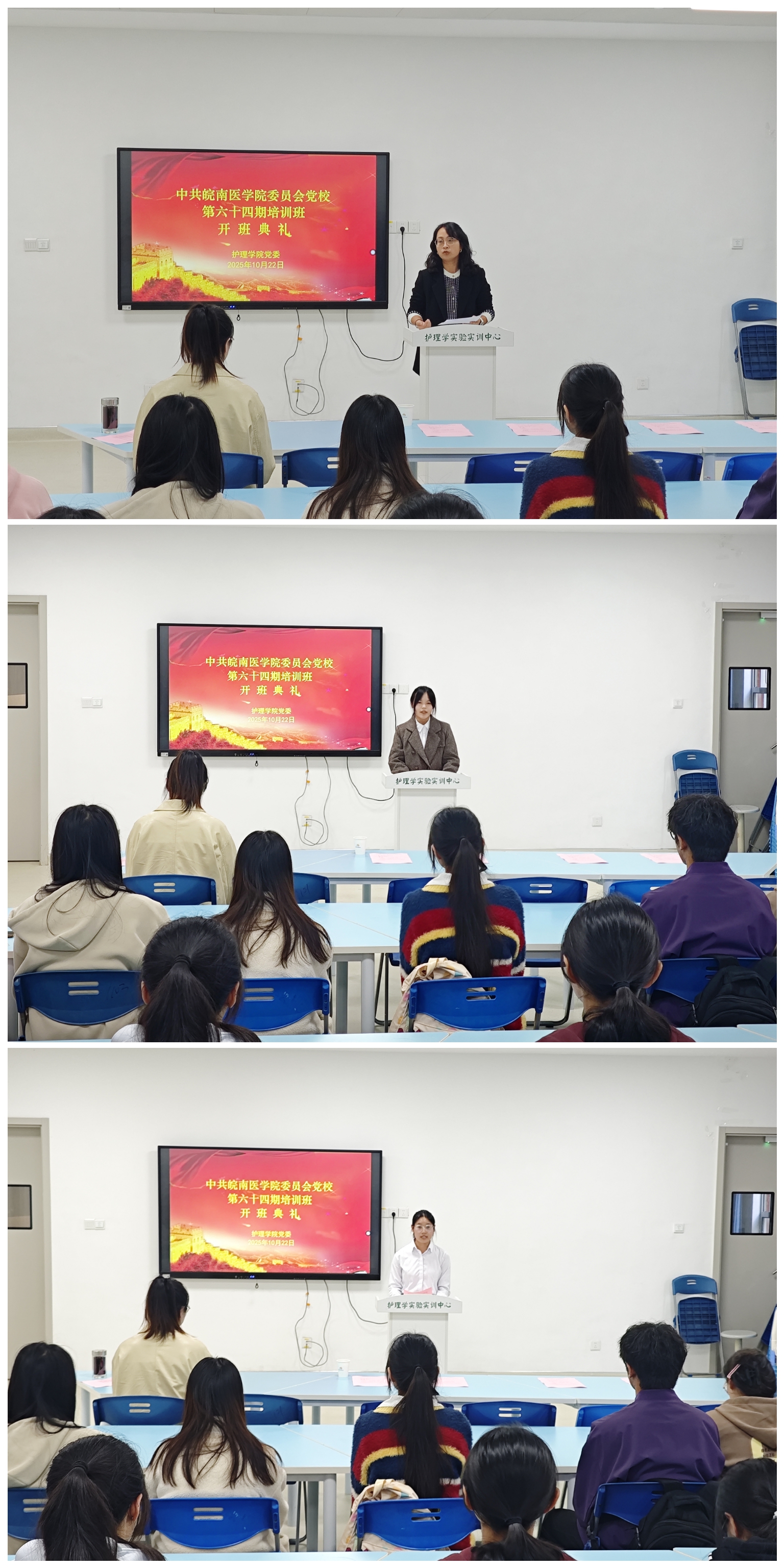 为切实做好入党积极分子培养教育工作,严把发展党员“入口关”,10月22日,护理学院党委在学院一楼会议室举行第64期入党积极分子培训班开班式暨专题授课。学院党委副书记王亚娟、培训班班主任沈阳和71名入党积极分子参加活动。开班式由学院团委书记范绮慧主持。