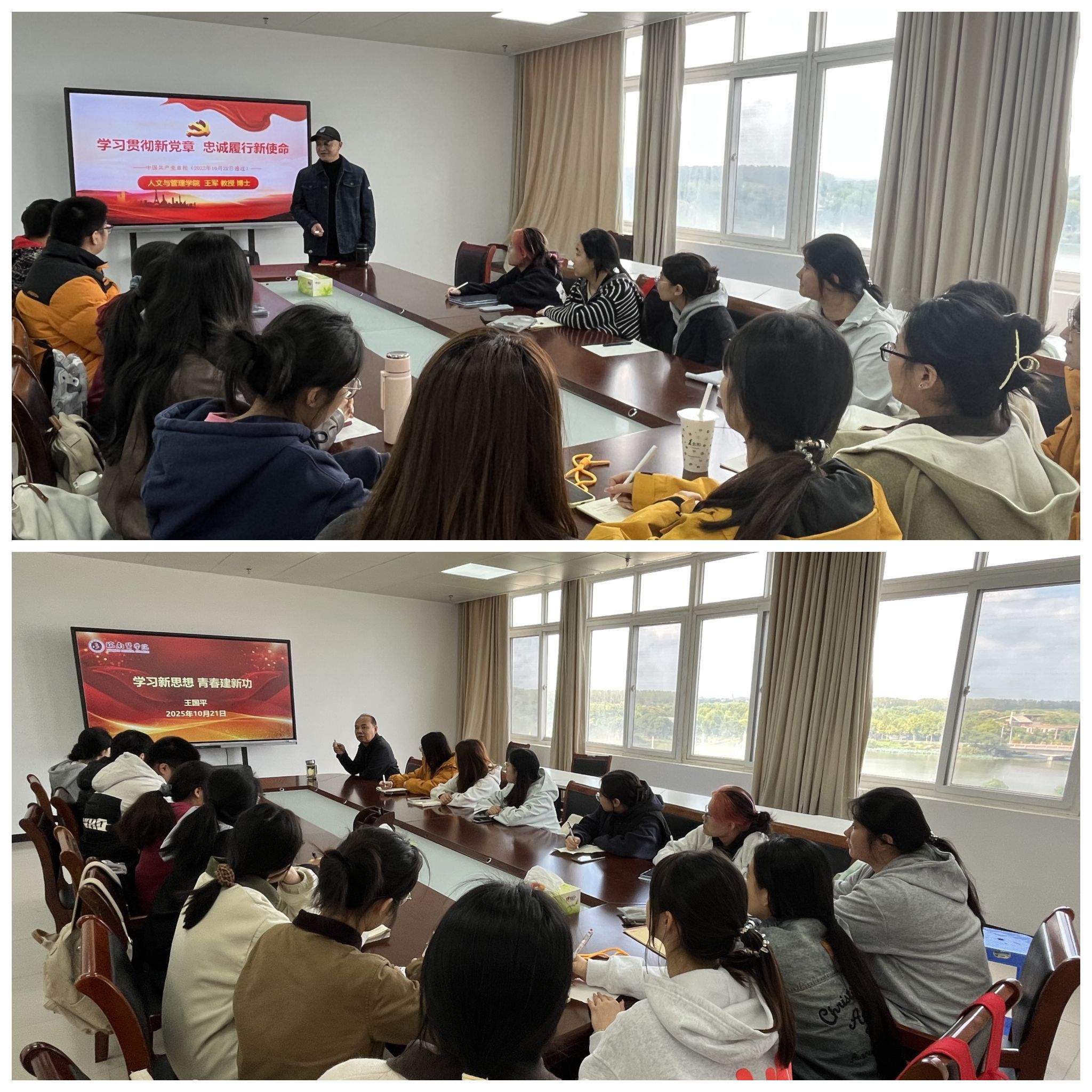 王军和学院党委副书记、院长王国平分别作专题党课。王军以《学习贯彻新党章 忠诚履行新使命》为题,围绕“习近平总书记关于党章的重要论述”“党章的历次制定及修订”“党的二十大党章的重要修改”等内容,系统阐释了党章的精神实质与时代内涵,引导学员以党章为镜锤炼党性,自觉向党员标准看齐、向党组织靠拢。王国平在《学习新思想 青春建新功》专题授课中,系统梳理了中国共产党的中心任务、建设社会主义现代化强国的战略安排等内容,深入解读新时代青年的责任与使命,强调我们学习、工作的根本立足点是为人民服务,激励全体学员坚定理想信念,勇担时代重任。