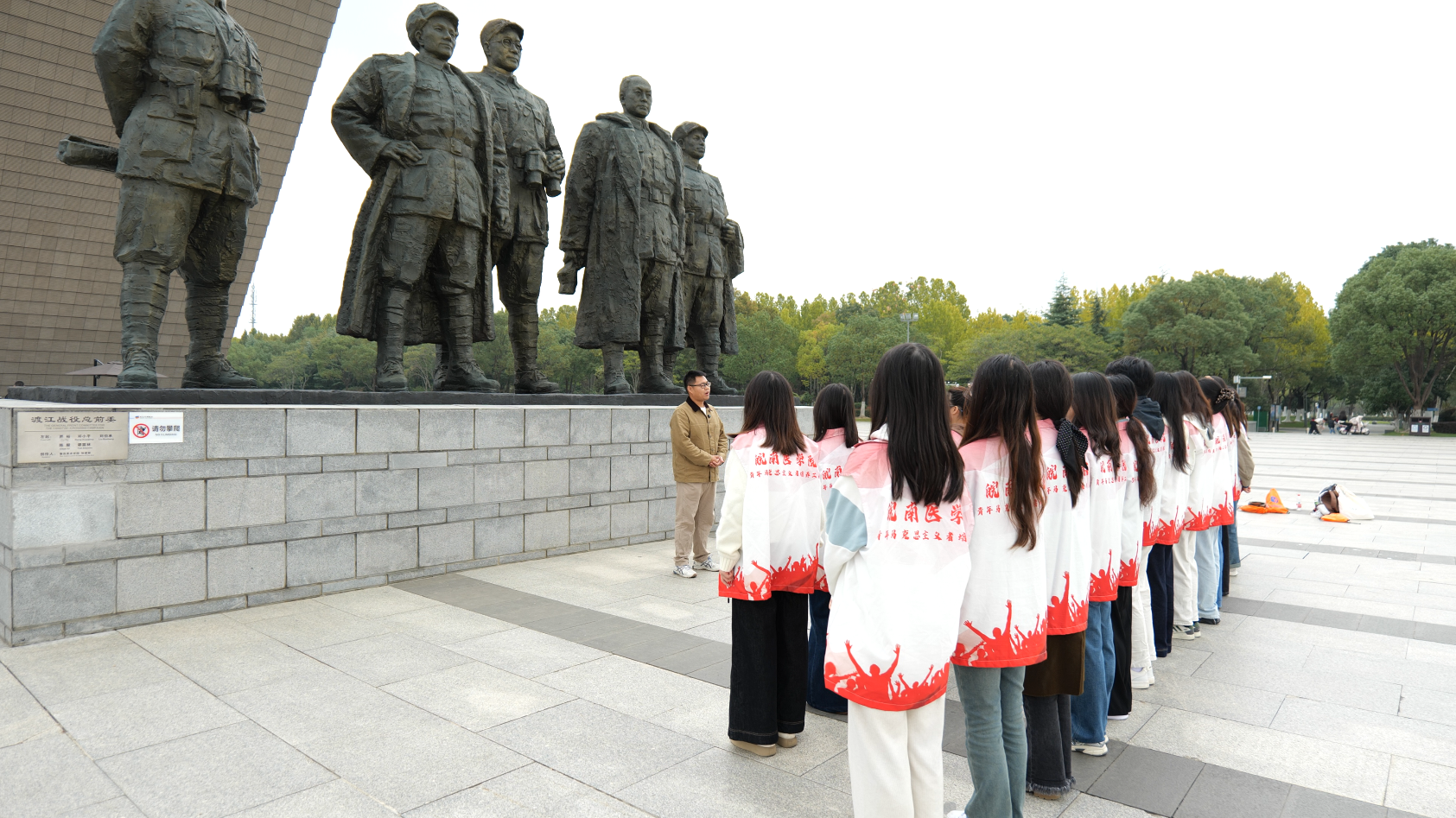 随后,团队走进渡江战役纪念馆。馆内“渡江第一船”模型与《我送亲人过大江》老照片引人驻足。学院王仓仓老师以320万民工支援、颜红英带伤摇橹、黄兴发摆渡官兵等事例,讲解“军民同心”的胜利密码,阐释“人民至上”的深刻内涵。护理学专业学生感悟,未来护理工作中需将患者放在心上,传承“民心所向”的精神。