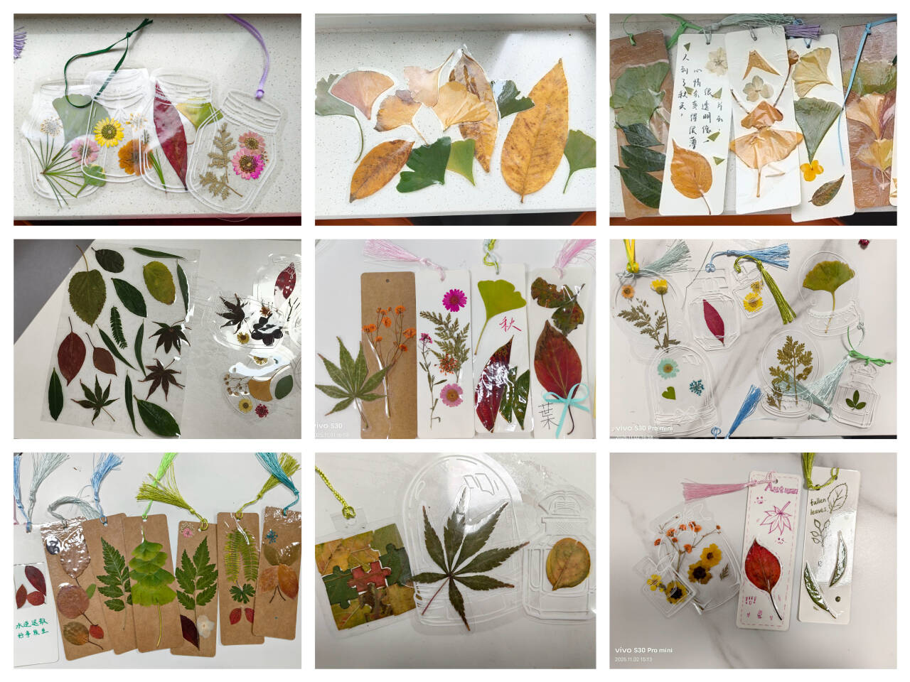 活动当日,学子们以收集的落叶为基础,搭配卡纸、颜料等工具展开创作:有的以落叶为底,用淡彩绘制银杏叶脉、秋日晚霞等景致,让自然元素与艺术创作相融;有的在书签边缘题录“我言秋日胜春朝” 等经典诗句,以文字意境点缀手工之美;还有的用金线勾勒叶片轮廓,或粘贴干花装饰,通过多样技法赋予书签独特质感。活动现场,同学们互相交流色彩搭配与构图技巧,在叶片剪裁、颜料晕染中感知手工创作的美学价值,让创作过程成为美育与思政同频共振的课堂。