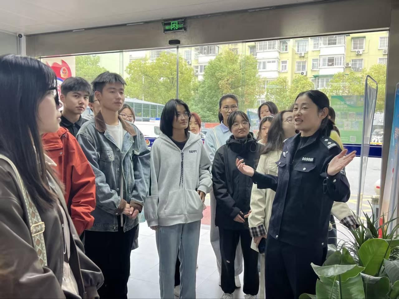 在派出所民警的引导下,同学们先后参观了反诈宣传中心、接警大厅、调解室、办案区等功能区域,详细了解了基层民警在开展日常接警、案件办理、群众服务及校园安全保卫等工作的具体流程。结合周边高校学生案件的特点,民警谷丽还向同学们介绍了多发性案件的防范知识与应对建议,并在参观学习间隙,为同学们分享了加入公安干警队伍的经验和体会。