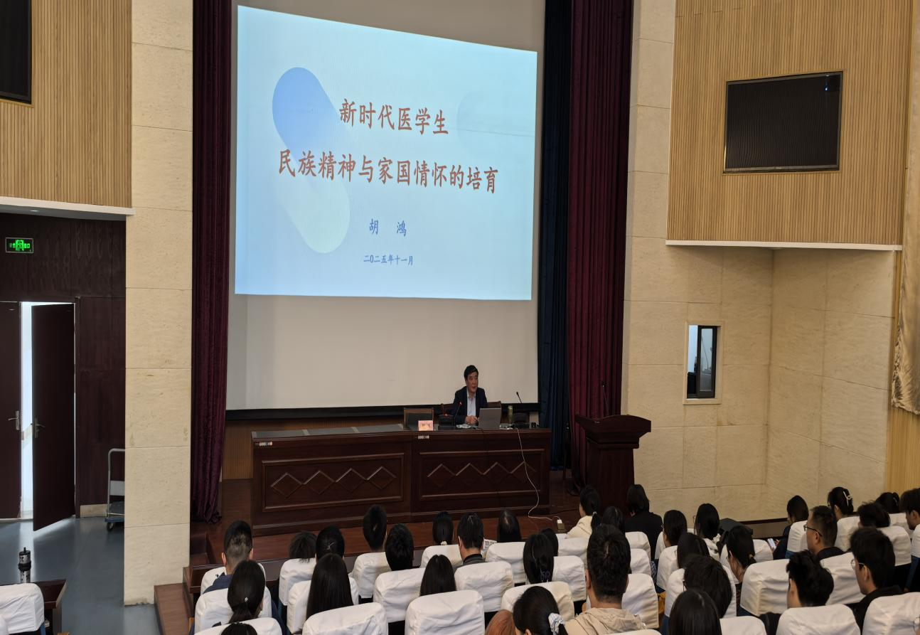 讲座中,胡鸿以生物医药“卡脖子”技术和基层医疗资源不均衡为切入点,结合医学教育使命与国家发展需求,提出新时代呼唤有民族精神与家国情怀的医学生,进而阐释民族精神与家国情怀的内涵、培养民族精神与家国情怀对医学生的重要性及实现路径,强调医学生需以视野为基、以格局为顶,既要做国际医学进步的参与者,也要做国家健康安全的守护者。