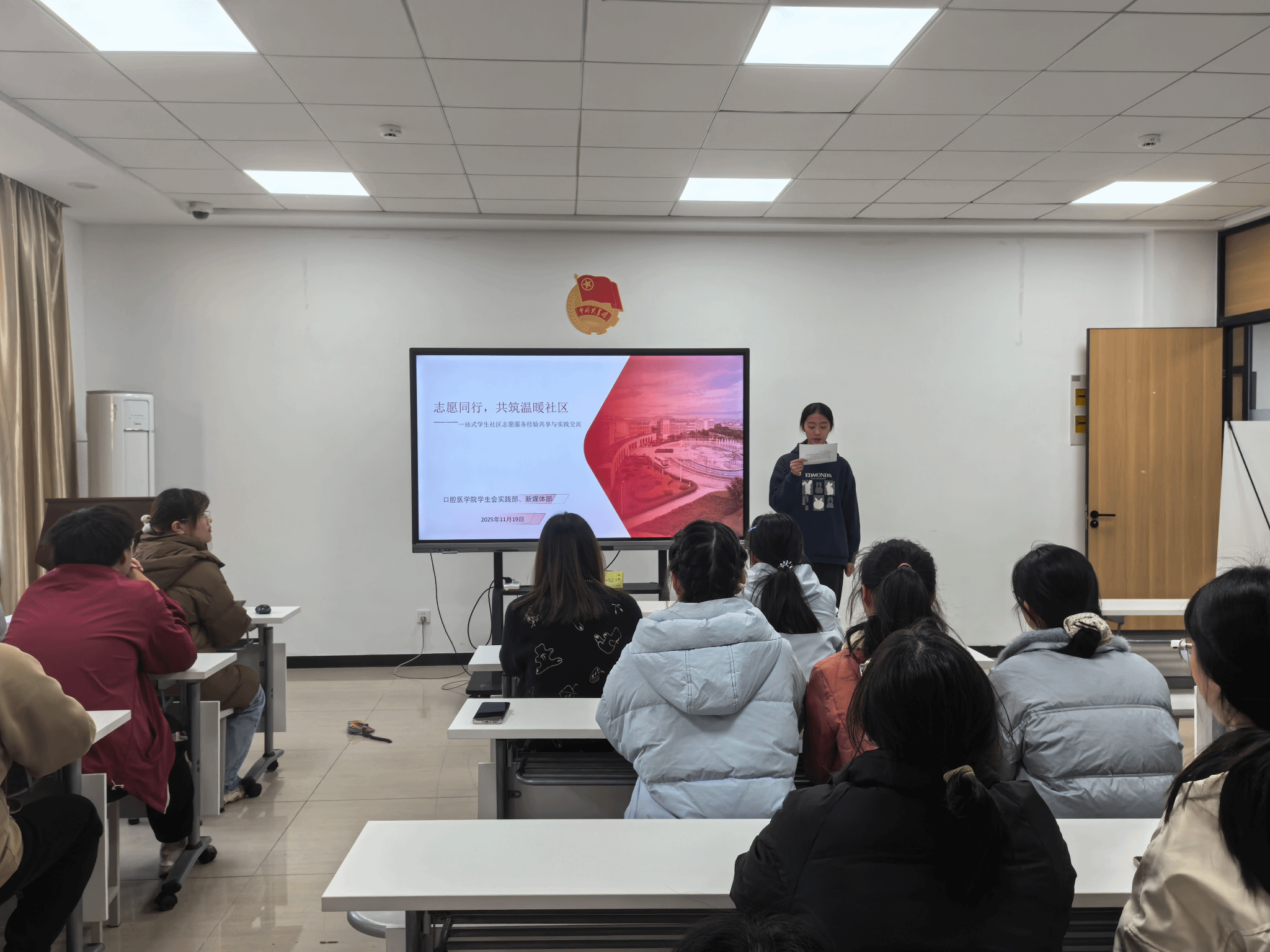 11月19日下午,口腔医学院在学院3楼教室举办“一站式”学生社区志愿服务交流会。本次活动邀请校“青马”社会实践团宋雨晨和“医见青心”志愿队刘思雨作为主讲嘉宾,口腔医学院各年级学生志愿者、志愿团队代表、“一站式”学生社区管理人员共同参与。