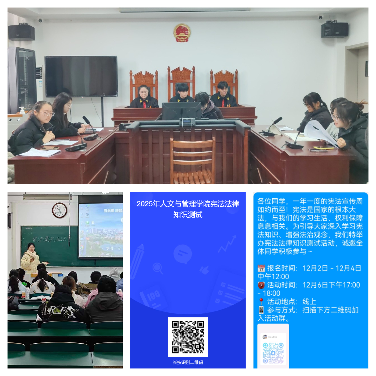 12月5日,学院举办大学生模拟法庭审判活动,该审判围绕“从35周岁到38周岁——公务员报考年龄调整的宪法分析”这一主题展开,原告方与被告方围绕公务员报考年龄限制规定是否侵犯公民平等权与劳动权这一议题,展开激烈辩论。通过沉浸式、观摩式的“模拟法庭”活动,让学生切身感受法律的威严,提升学法、知法、懂法的能力。此外,人文与管理学院组织宪法法律知识测试以及共度一段“宪法晨读”时光活动,有效深化广大师生对宪法精神的理解,夯实了宪法知识储备,筑牢了宪法知识根基,提升了宪法实践素养。