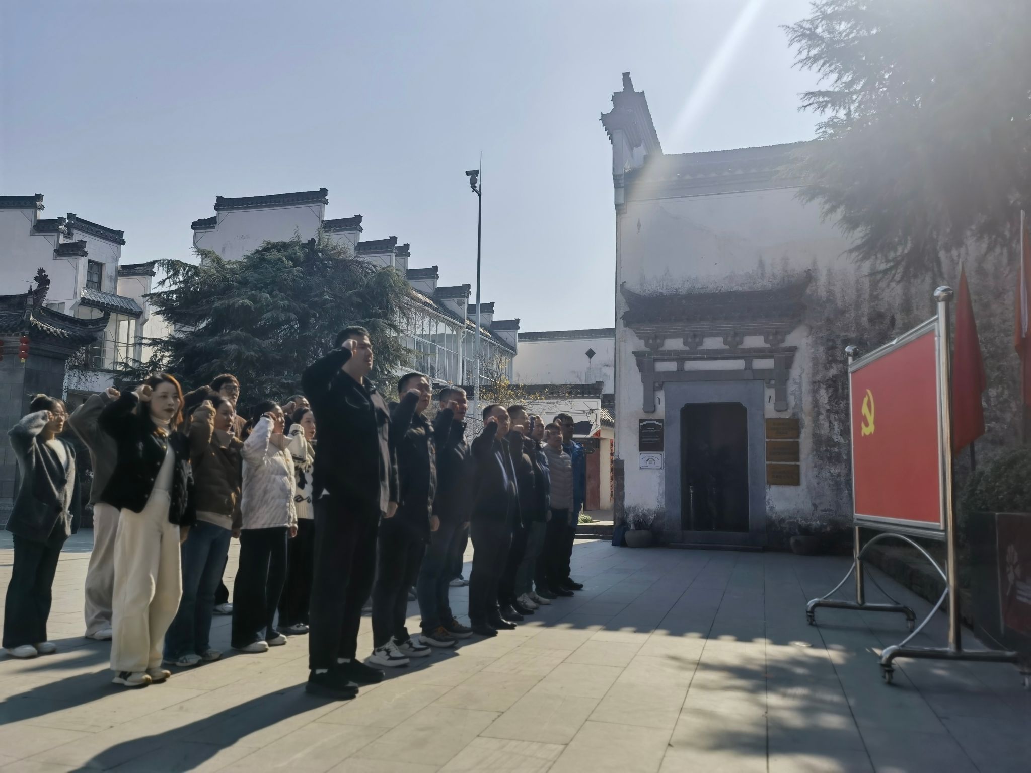 随后,大家在纪念馆前,面对庄严、鲜红的党旗宣誓,重温入党誓词。