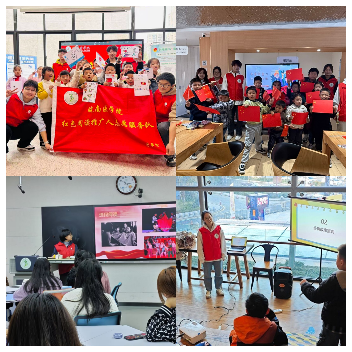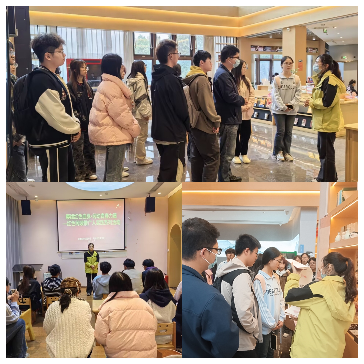 活动期间,图书馆组建多支红色阅读推广小分队,分校内与校外同步开展阅读活动。在校内学生社区、图书馆读者培训室、会议室等,各队举办了读书分享会、红色经典诵读、经典名著“有声书”、主题班会和线上共读打卡等形式各异的阅读活动;同时,在指导老师带领下,部分青年学生深入到江湾书院、花津书苑、新华书店等地,为当地儿童开展绘本讲读、红色故事展演、红色主题手工等阅读与体验活动。系列活动形式多样、精彩纷呈,累计吸引近400人次踊跃参与,不仅有效推动了红色文化普及与传播,也营造出“人人读红色、时时有感悟”的浓厚氛围。