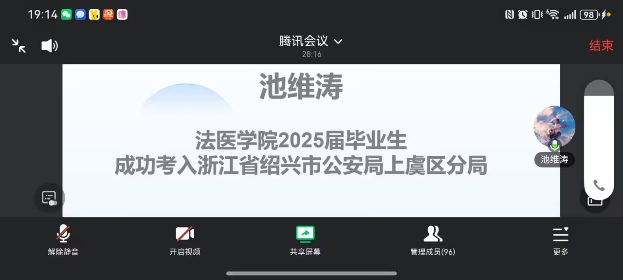 为帮助法医学子系统备考浙江省公务员考试,提升就业竞争力,12月14日晚,法医学院在“一站式”学生社区通过线上成功举办浙江省公务员考试线上经验交流会。活动由法医学院党委副书记王夏露主持,特邀2025届毕业生、绍兴市公安局上虞分局民警池维涛担任主讲嘉宾,吸引了全院各年级百余名学生线上参与。