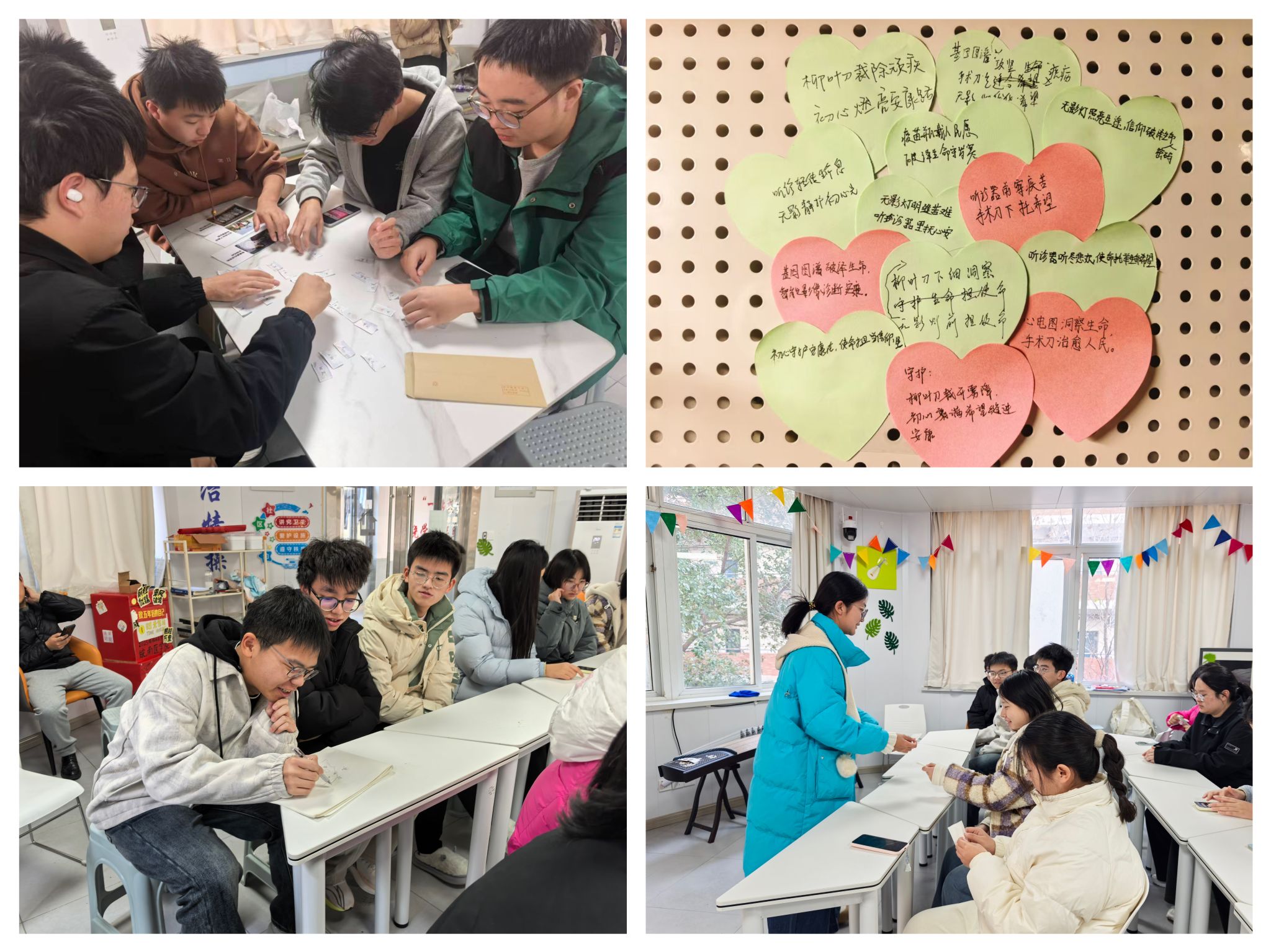 为增强学习体验,活动设置了丰富多样的互动环节。既有“诗图速拼”“情报破译”“医路长征・青春担当”主题拼贴诗创作等兼具挑战性与趣味性的闯关任务,也涵盖拼贴诗展示、你画我猜、绘画接力及集体朗诵等互动形式。同学们积极参与、踊跃互动,在动手实践与协作配合中,进一步加深了对红色诗篇内涵的理解,让红色精神在沉浸式体验中入脑入心。