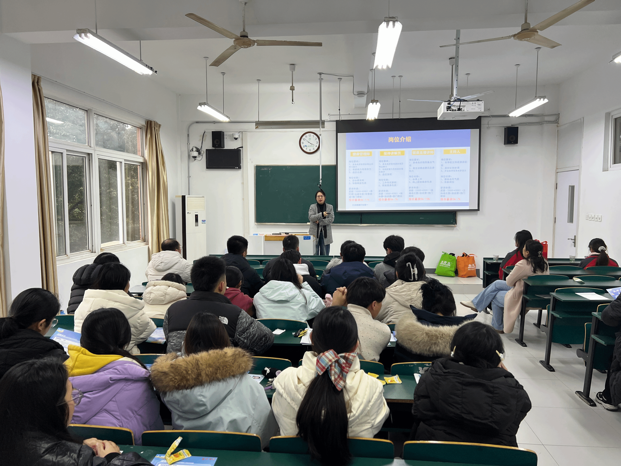 招聘会伊始,郎玉秋为同学们带来了内容丰富、实用性强的专题分享。她从企业发展历程、规模实力、核心业务与企业文化入手,全面展现了公司的行业地位与综合优势。针对毕业生求职过程中常见的困惑与风险,聚焦简历撰写、面试技巧、合同签订与资质核查等关键环节,倾囊相授诸多“避坑”指南与法律常识,有效提升了同学们的求职安全意识与职场辨别能力。在随后的岗位发布环节,吴玉莹详细介绍了本次招聘的实习生岗位需求、具体职责、系统的职业发展通道以及具有竞争力的薪酬福利体系,清晰的规划与完善的保障引发了在场同学的浓厚兴趣。