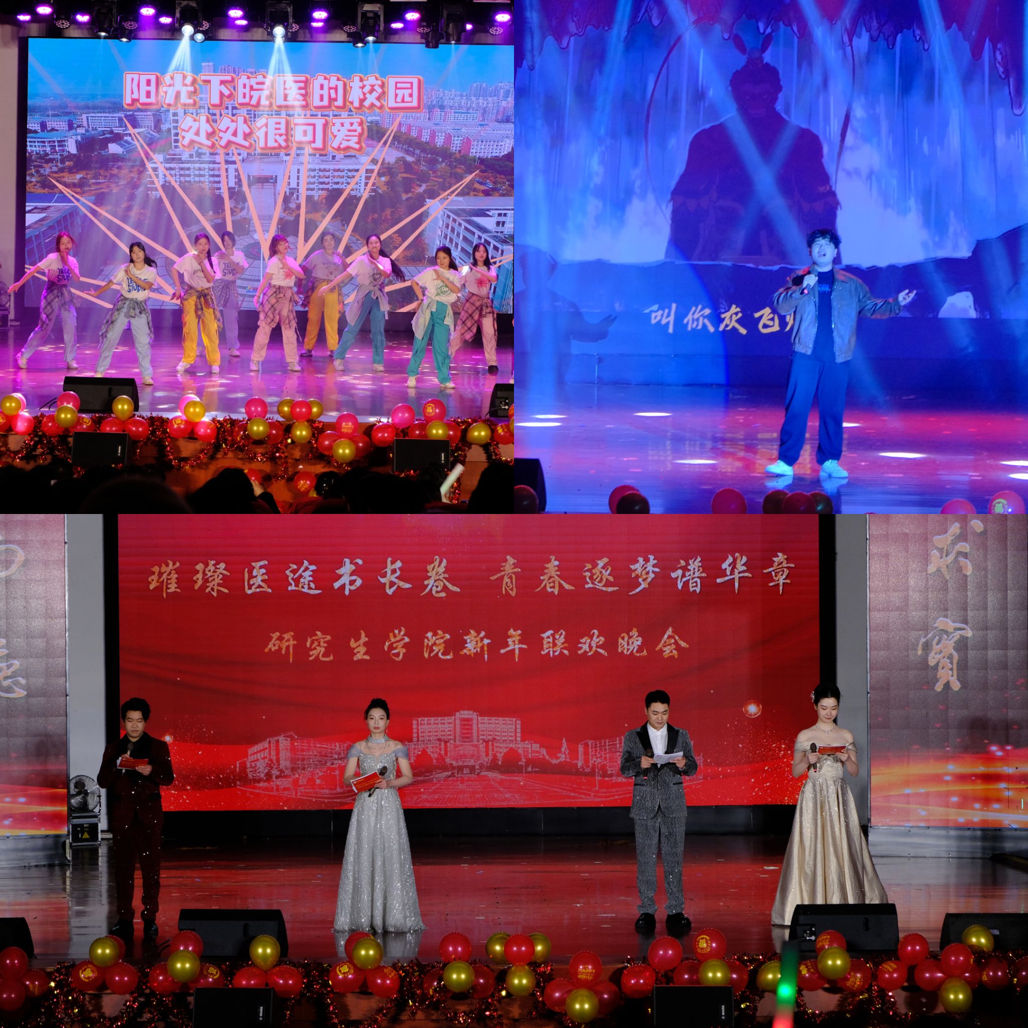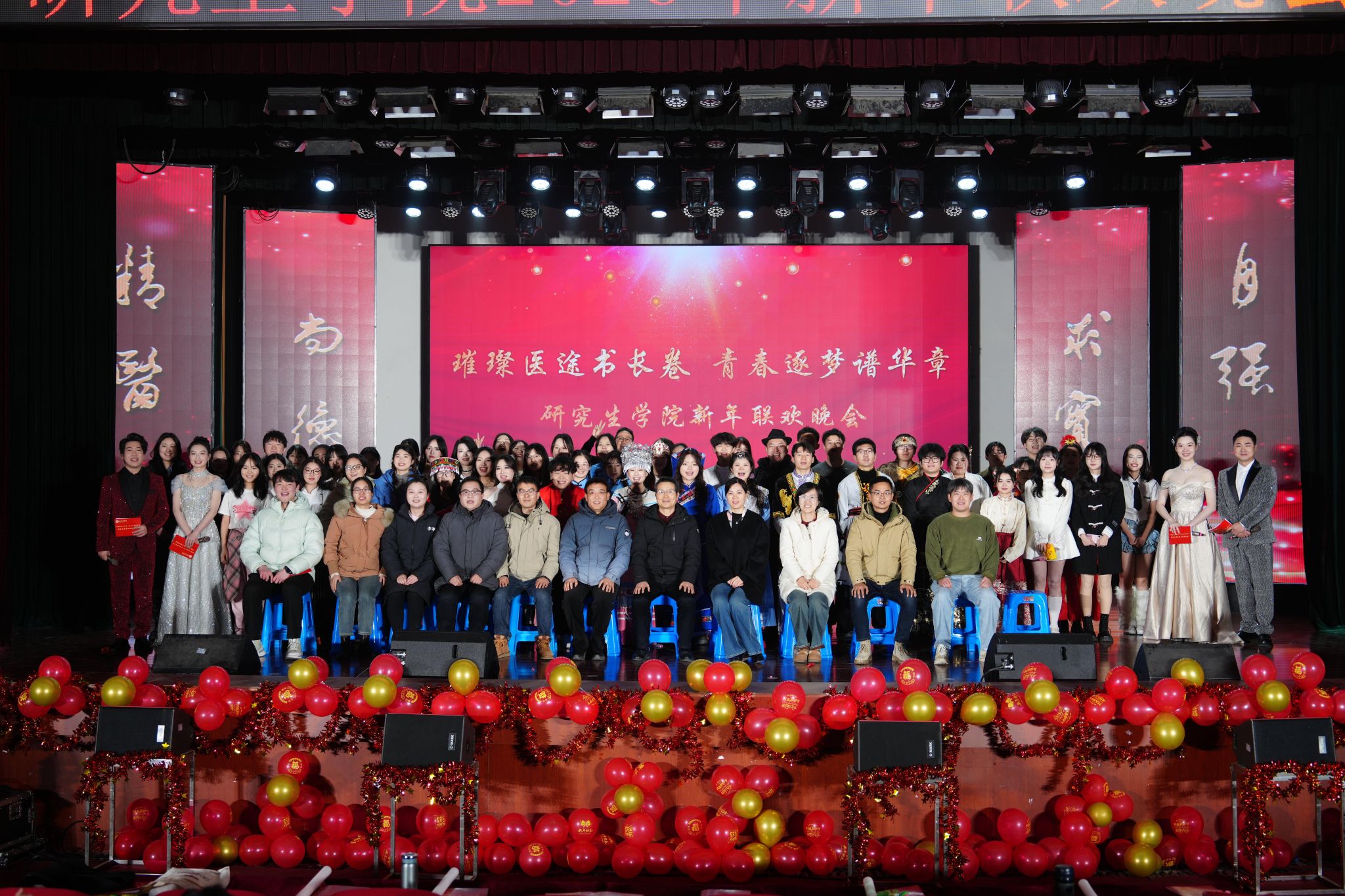 岁序更替,华章日新。为进一步丰富校园文化生活,厚植爱国荣校情怀,展现新时代研究生昂扬向上的精神风貌,1月8日晚,研究生学院在大学生活动中心隆重举办“璀璨医途书长卷,青春逐梦谱华章”2026年新年联欢晚会。学院全体教职工和六百多名学生欢聚一堂,同贺新年到来。