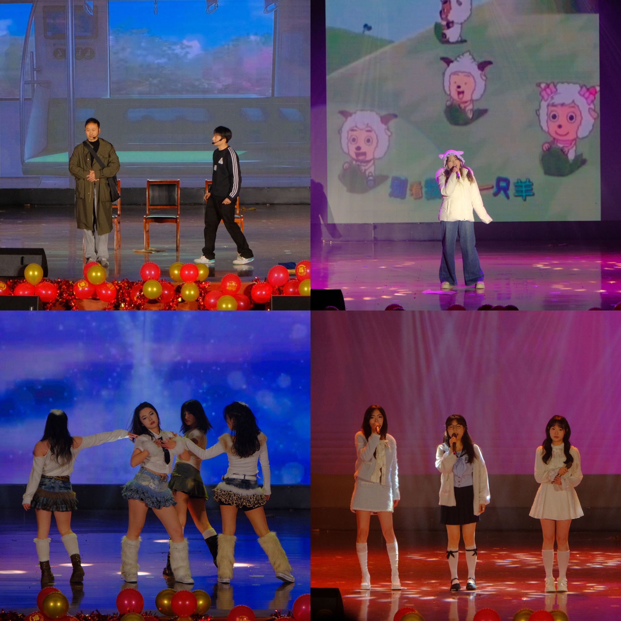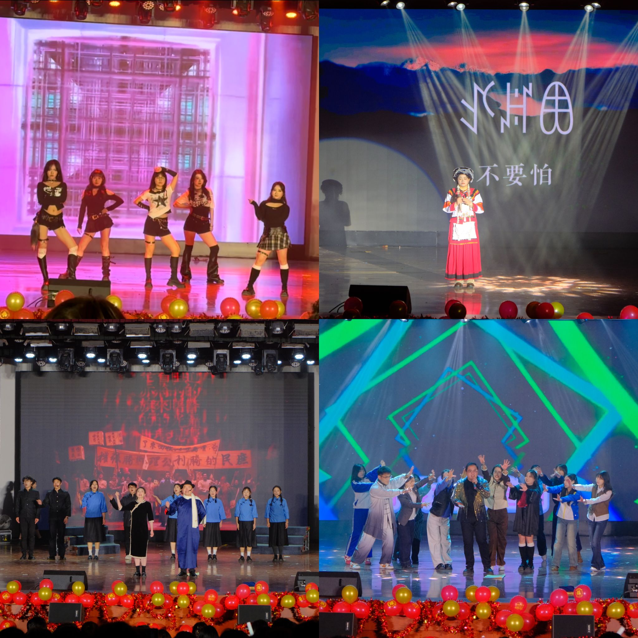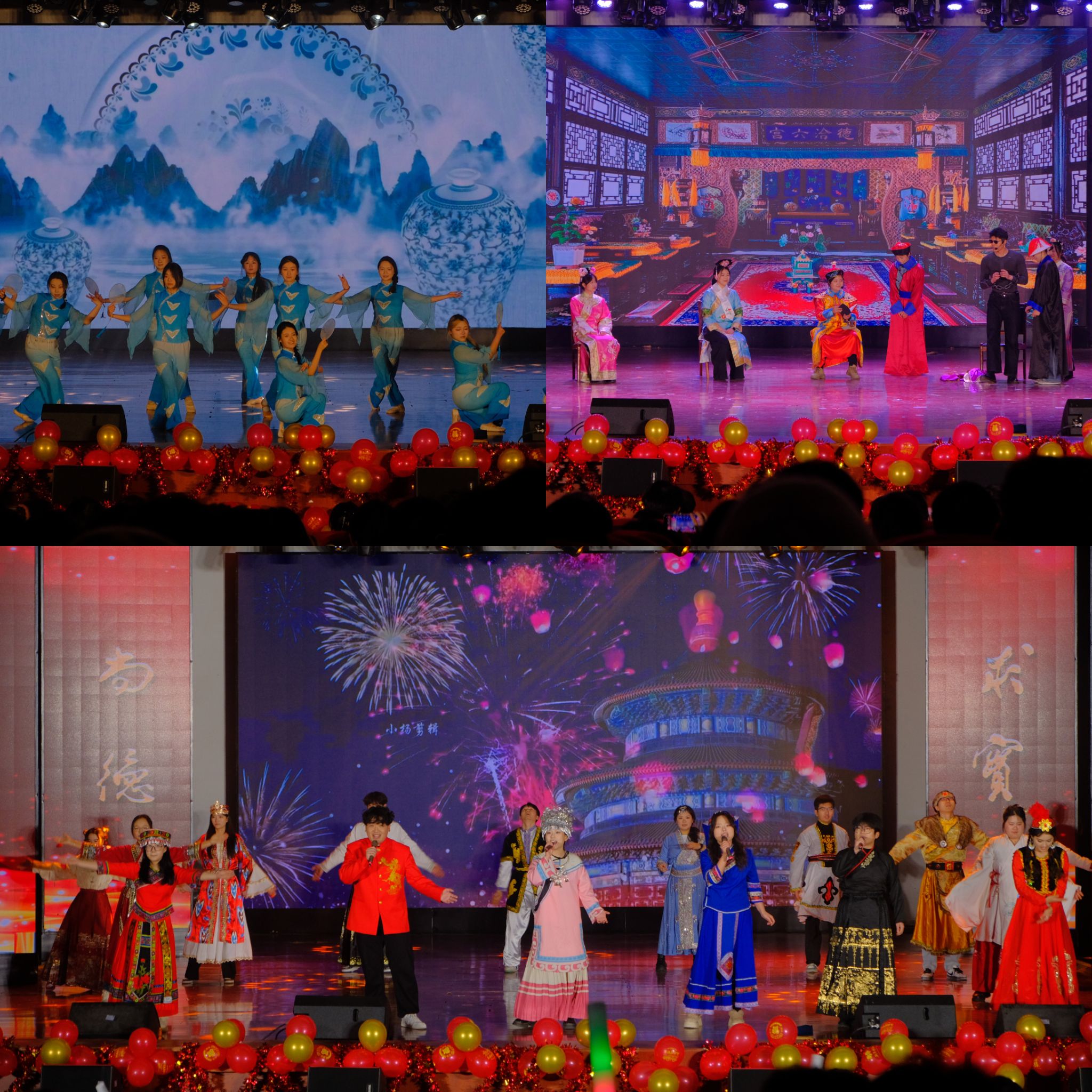 晚会现场光影交错,精彩纷呈,师生联袂呈现了一场震撼的视听盛宴。大学生艺术团舞蹈《第一天》热情开场,瞬间点燃气氛。独唱《悟空》气场全开,歌舞《改变自己》与舞蹈《魔力绽放》尽显青春蓬勃朝气。独唱《不要怕》温暖治愈,朗诵《青春中国》铿锵有力,激荡起在场师生的爱国情怀。小品《主角光环》幽默风趣,歌曲串烧《童年串烧》与《多远都要偏爱着你》深情款款。舞蹈《青花瓷》古韵悠长,《梦想成真》寄托美好憧憬。小品《翊坤宫校园诈骗集团覆灭记》独具匠心,寓教于乐。最后,合唱《魅力中国》气势恢弘,将现场气氛推向最高潮,为晚会画上了圆满句号。