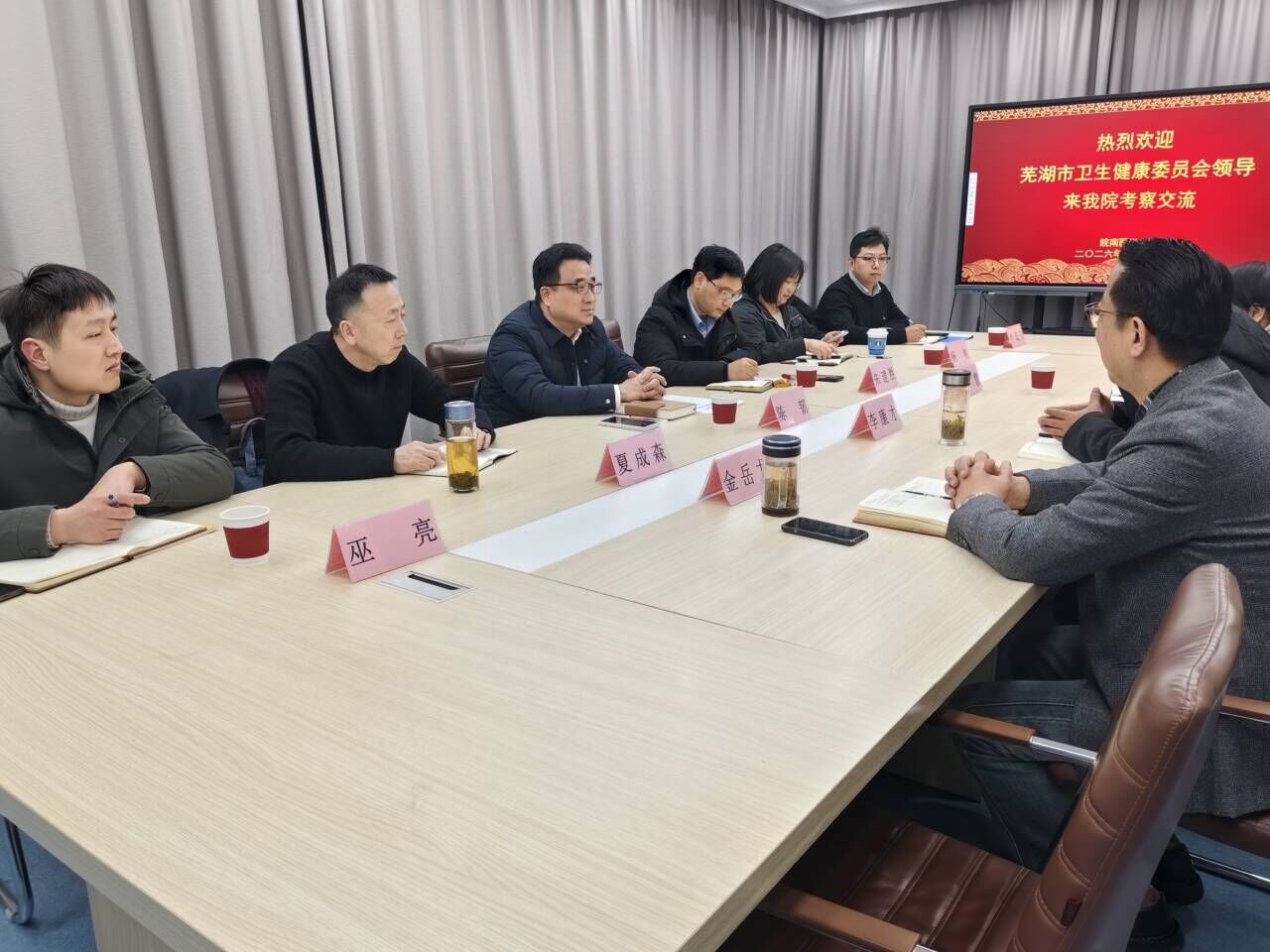 李康才代表学院对考察团的到来表示欢迎,并简要介绍了学院以党建引领业务发展的整体情况及校地合作基础。金岳龙详细汇报了学院学科建设、人才培养、科研成果等方面的进展,系统阐述了学院服务区域公共卫生事业的规划与诉求。陈韧、朱建胜等先后介绍了芜湖市公共卫生防控体系建设成效、疾控中心业务开展情况及发展需求,并对学院办学成果给予高度评价。