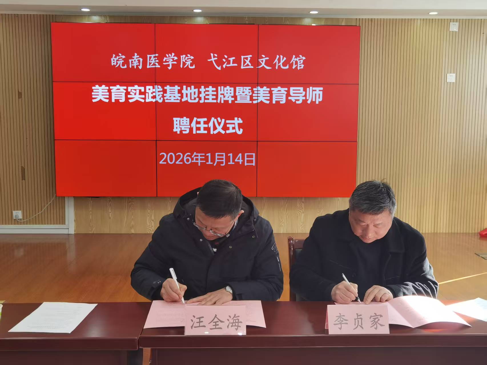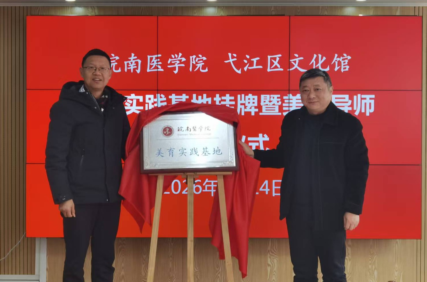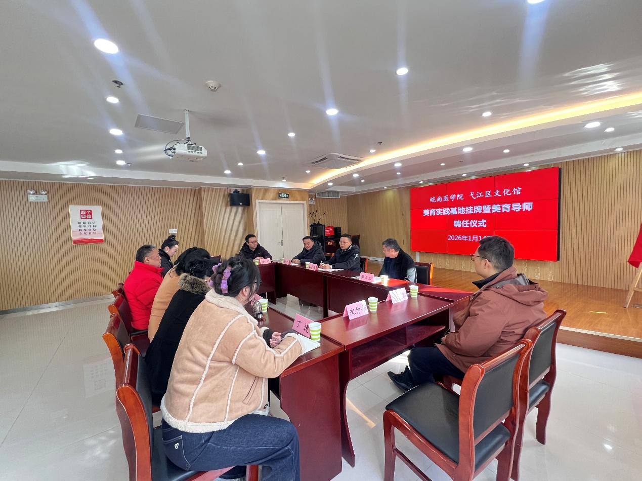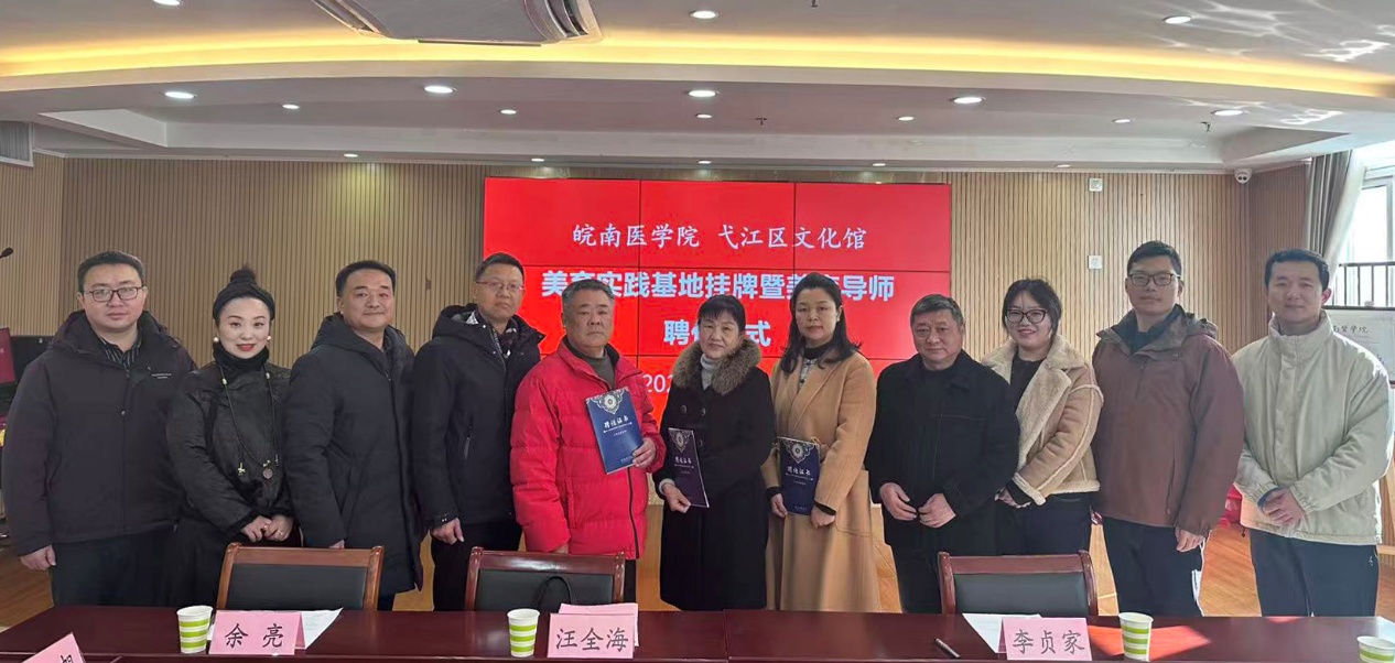 1月14日,公共基础学院与弋江区文化馆举行美育实践基地挂牌暨美育导师聘任仪式。活动以“共建共享、协同育人”为主线,含非遗作品展示、实践基地揭牌、美育导师聘任、签订合作协议等内容。