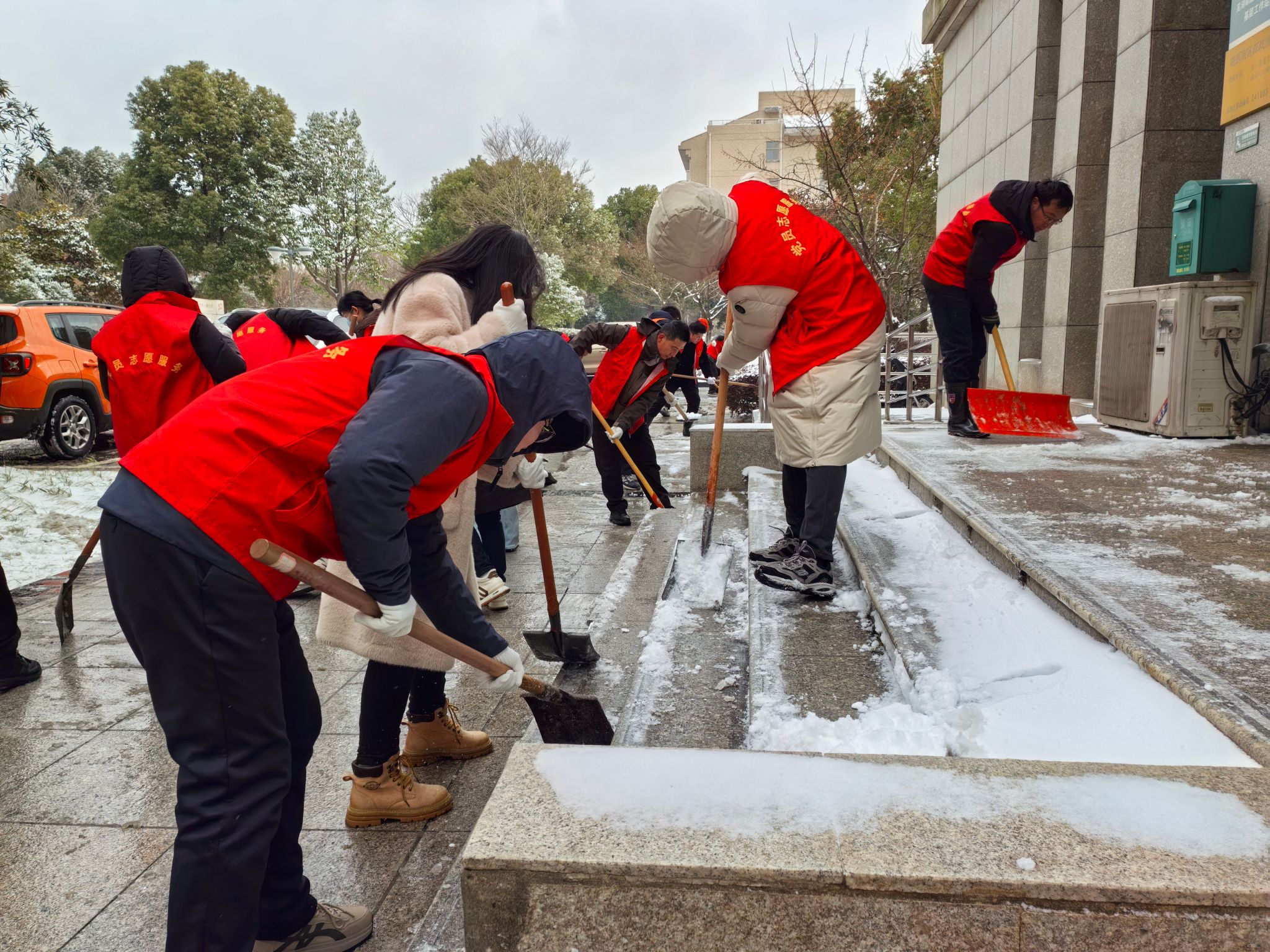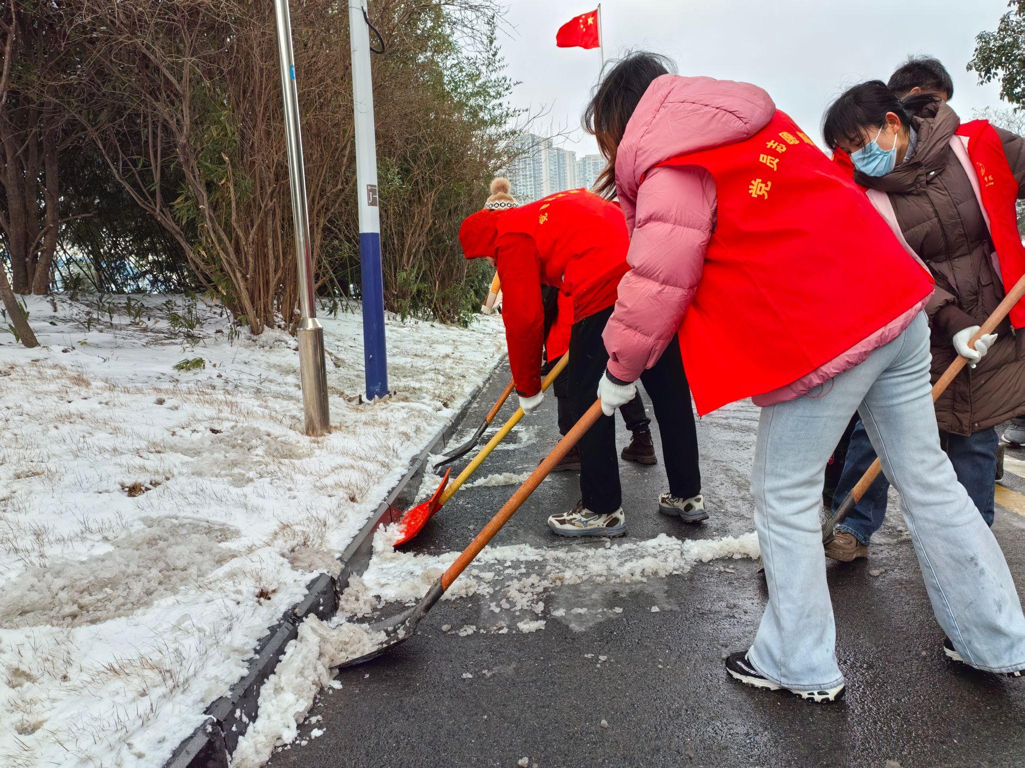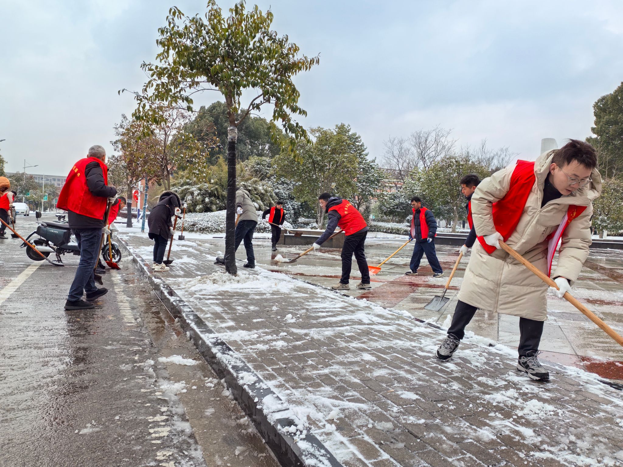 尽管户外雪花纷飞、寒意袭人,全体志愿者不畏严寒、齐心协力,积极投身破冰铲雪。党员干部带头示范,普通党员踊跃参与,大家手持铁锹、雪铲,干劲十足、配合默契。经过近两小时的持续奋战,责任区域的积雪与冰层被彻底清除,校园道路恢复畅通。