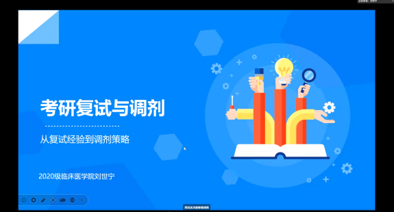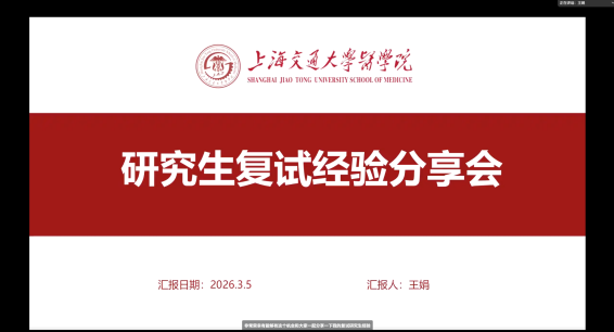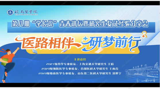 医路相伴,研梦前行。3月5日,校第八期“学长说”青春讲坛暨研究生复试经验分享会在云端顺利举行。本次活动特别邀请三位2025届毕业生:上海交通大学药学专业研究生王娟,首都医科大学公共卫生专业研究生王雨青,山东第二医科大学妇产科学专业研究生刘世宁担任主讲嘉宾,他们结合自身考研复试备考经历,从复试流程、面试技巧、调剂策略等方面为400余名同学带来干货满满的经验分享,为同学们的求学之路保驾护航。