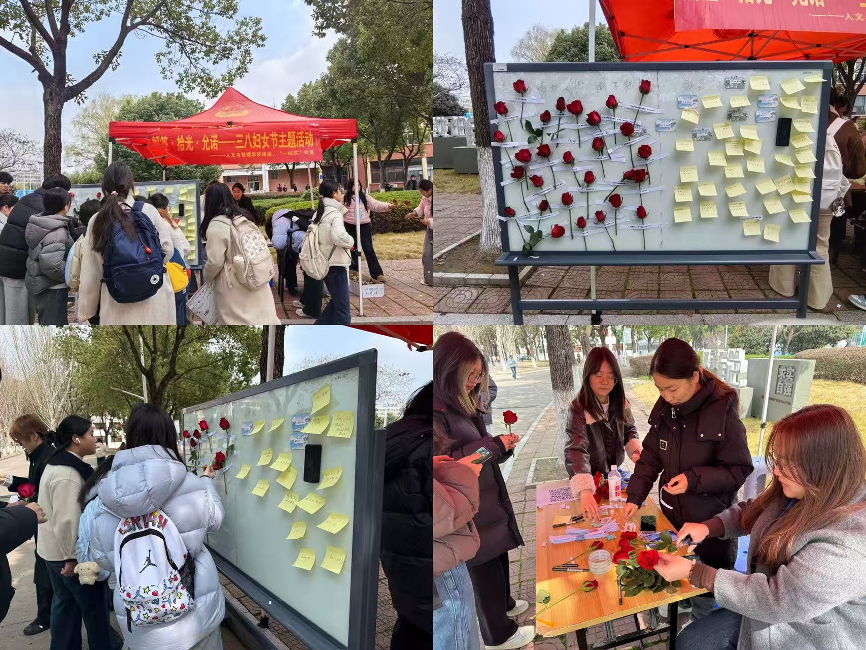 3月6日中午,学院团委在校园篮球场举办“解签·拾光·予诺”校园公共互动活动,旨在通过“撕纸破刻板”、“领花寄心意”、“书写送祝福”等环节,用行动打破性别偏见,用笔尖传递温暖祝福,现场气氛温馨而热烈。学生会成员将剩余的玫瑰花赠予女老师、女宿管及食堂阿姨,让这份温暖流淌至校园的每一位女性劳动者心间。