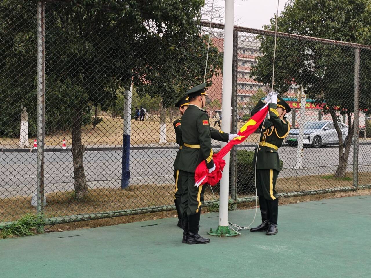 7时10分,国旗护卫队身着统一制服,以铿锵步伐护送五星红旗抵达升旗台。伴随着激昂的《义勇军进行曲》,全体师生肃立注目,高唱国歌,五星红旗冉冉升起、迎风飘扬,爱国情怀与青春理想在国旗下交融激荡。