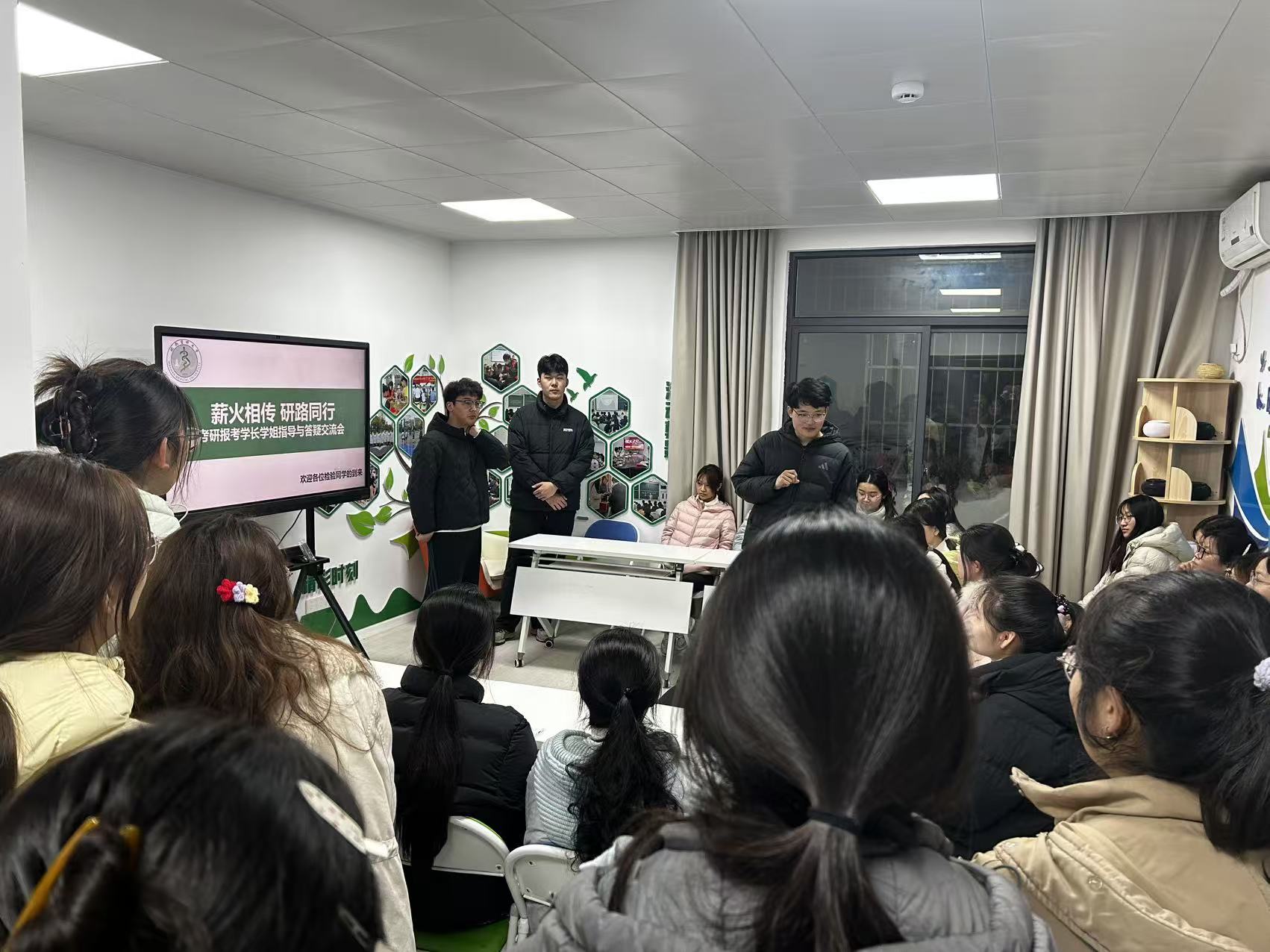 为帮助低年级学子明晰考研方向、掌握备考方法,营造勤学善思、互助共进的优良学风。3月17日晚上,检验学院在“一站式”学生社区明德行苑举办“薪火相传,研路同行”考研解惑面对面交流会。本次活动邀请了6位2025届成功考取本校临床检验诊断学专业的研究生担任分享嘉宾,医学检验技术专业50多位有兴趣的同学参加,活动现场氛围热烈、干货满满。