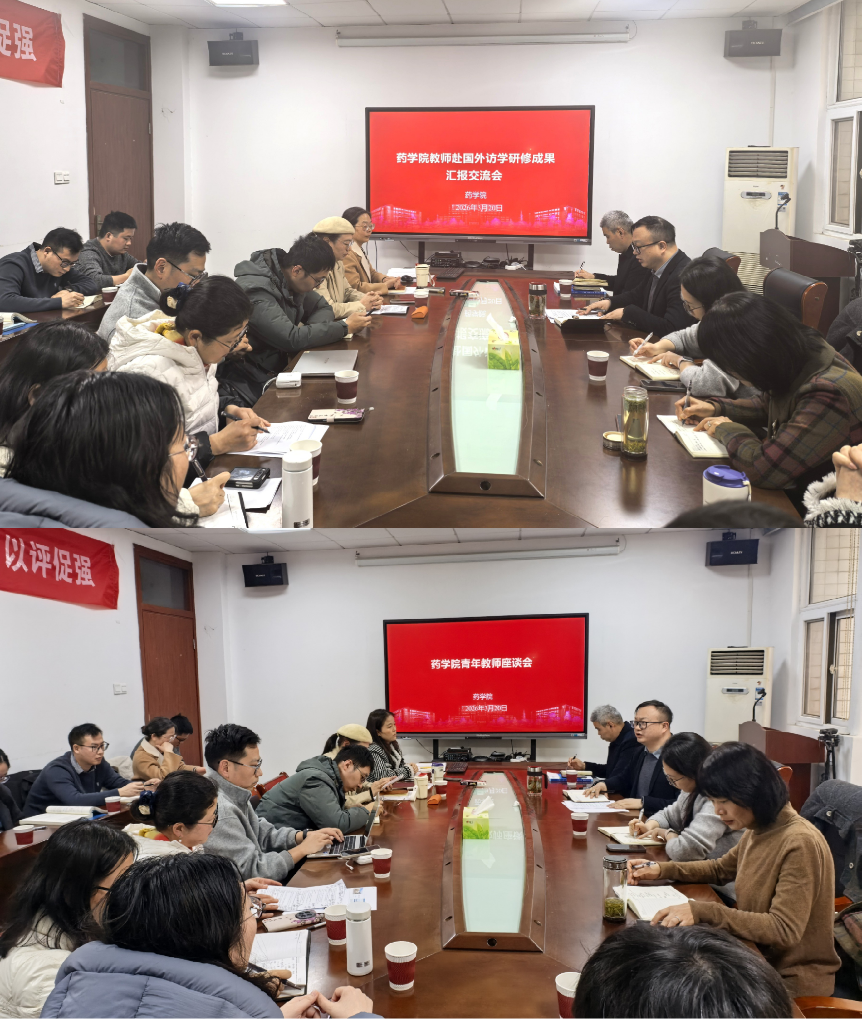 3月20日下午,药学院召开骨干教师赴国外访学研修成果汇报会暨青年教师交流座谈会。人事处副处长万磊、国际合作与交流处副处长蒯文婷、药学院各教研室主任、国外访学归来人员及近三年新进博士等人员参加会议,会议由药学院副院长王国栋主持。